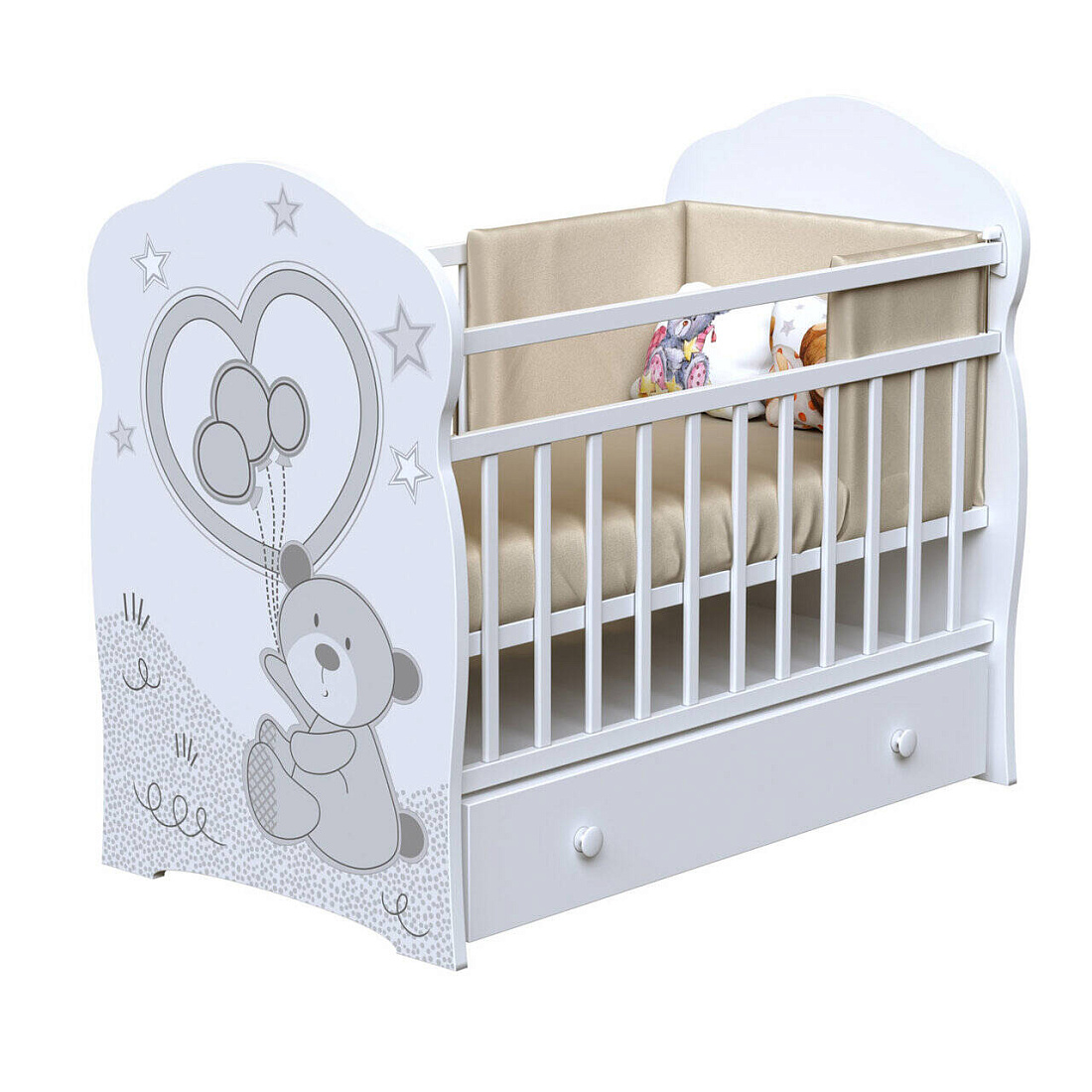 В кроватке установлено устройство для укачивания поперечного типа. Укачивание осуществляется бесшумно, плавно, ребенок легко и быстро засыпает. Если нужно, маятник можно не использовать. Есть в модели откидная планка и накладка из ПВХ. Спальная основа двигается по высоте, фиксируется на двух уровнях. Внизу расположен увесистый выдвижной ящик, куда можно положить все детские вещи.