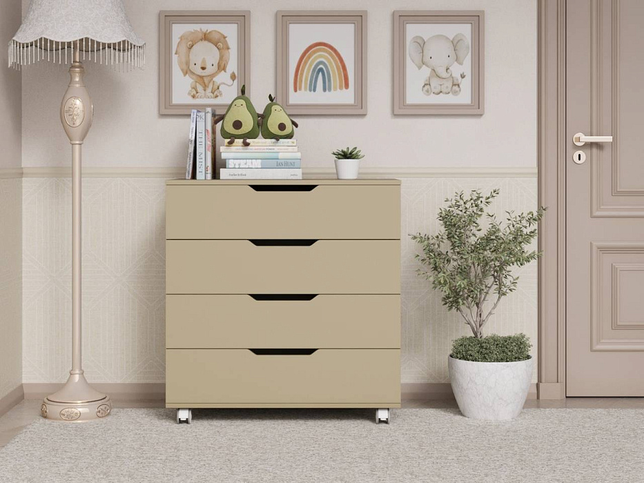В комплекте идут прорезиненные колеса со стопором при помощи которых удобно передвигать комод во время влажной уборки комнаты.