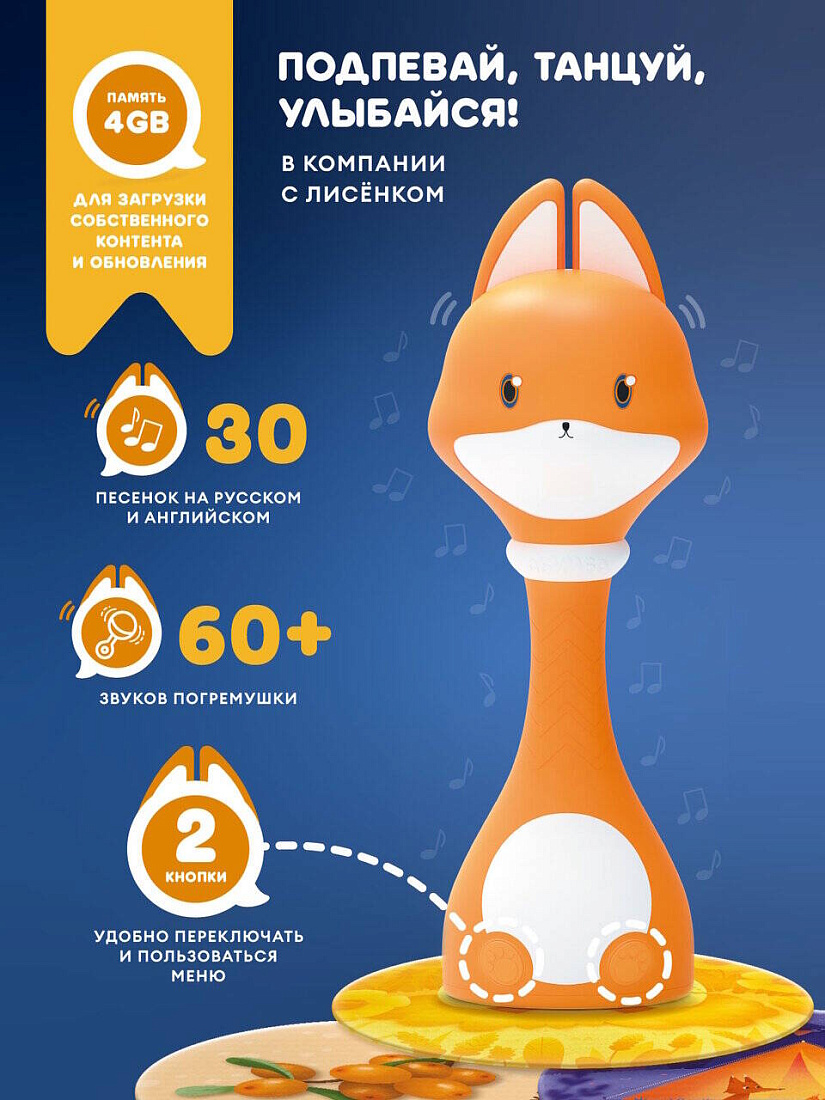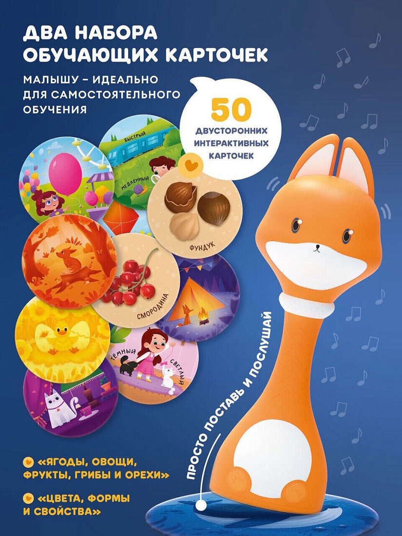 Какими бы похожими мы ни казались с зайкой, у нас найдётся несколько различий. Во-первых, я всё-таки лисёнок. Во-вторых, меня придумали и нарисовали в Санкт-Петербурге. В-третьих, две кнопки, чтобы с удобством переключать контент и пользоваться меню. В-четвёртых, я обладатель замечательной памяти: целых 4 Гб на борту! В-пятых, и это самое важное, любовь к говорению: с удовольствием озвучиваю картинки с карточек и карт из комплекта, которые одновременно обучают и развлекают.