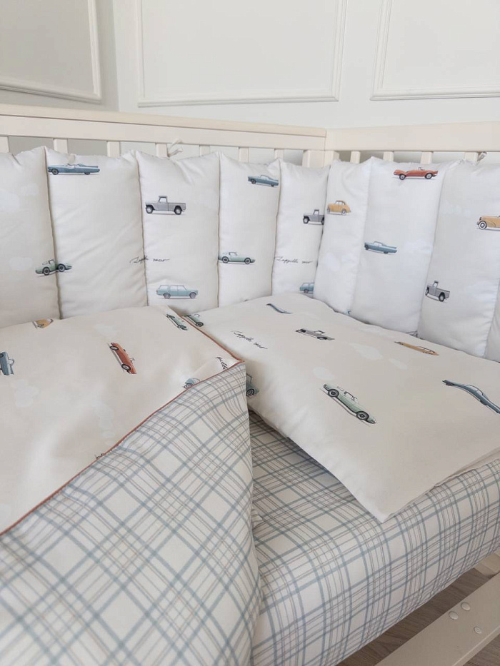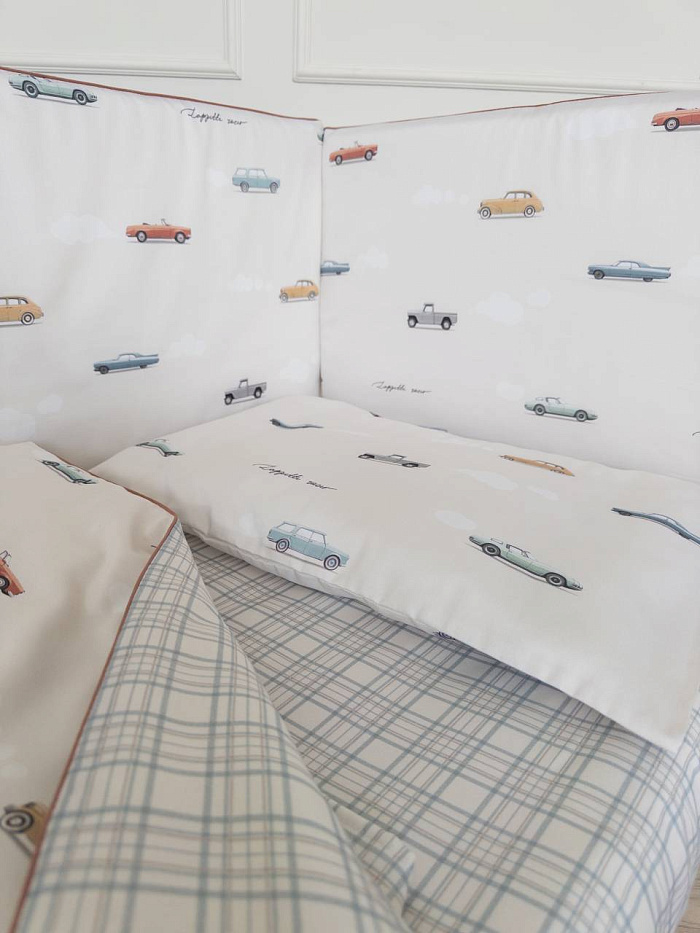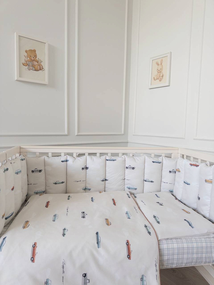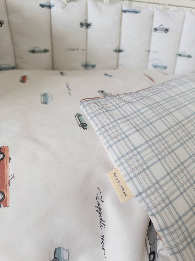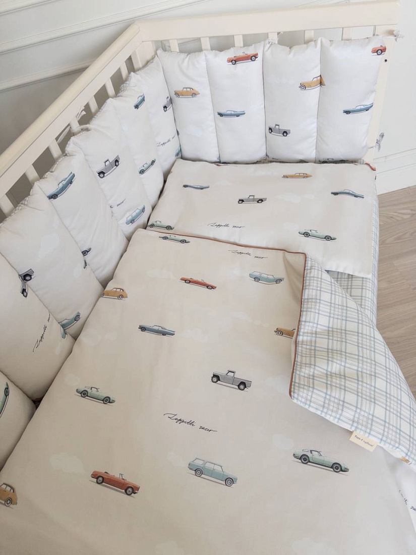 Комплект 6 предметов для прям. кроватки "Маленький гонщик", цв. серо-голубой