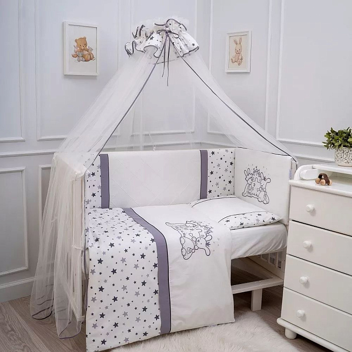 это полный комплект постельных принадлежностей в овальную кроватку для новорожденного. Нежный и комфортный, комплект выполнен из тончайшего сатинового полотна европейского качества, имеющего сертификат OEKO - TEX Standart 100. Изделие традиционно украшено тонкими кантами, отделочными строчками и изящной вышивкой. Чехлы бортиков съемные на молниях, что значительно упрощает уход за ними.