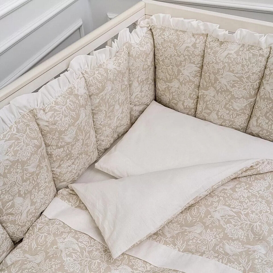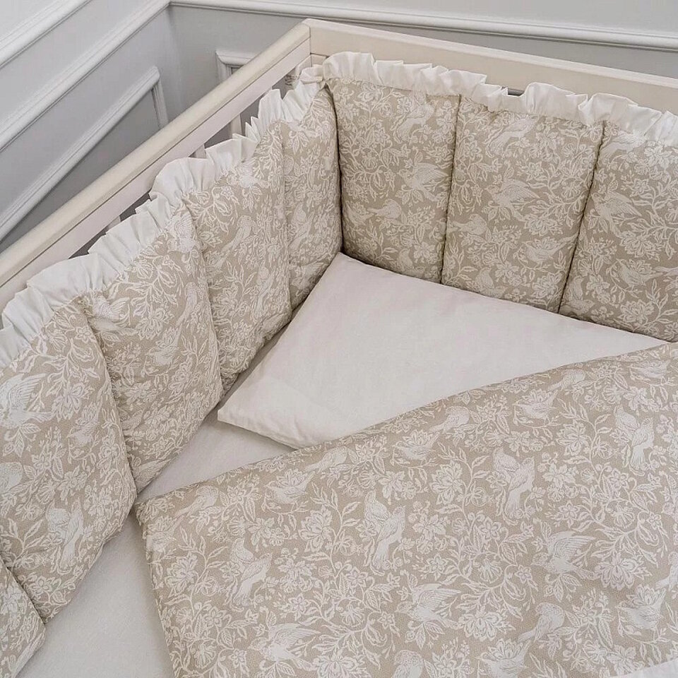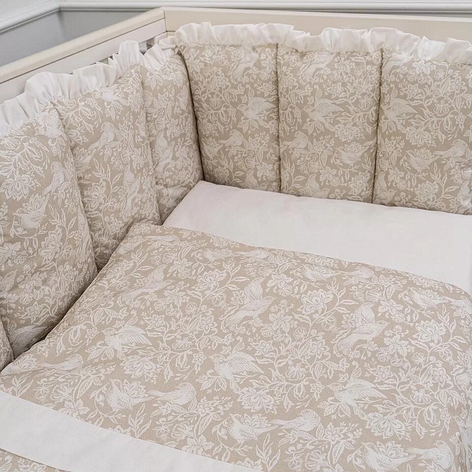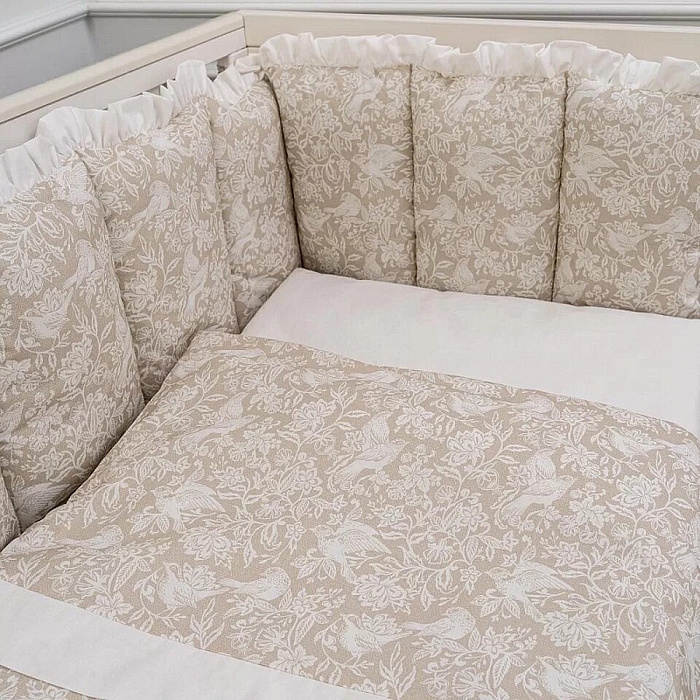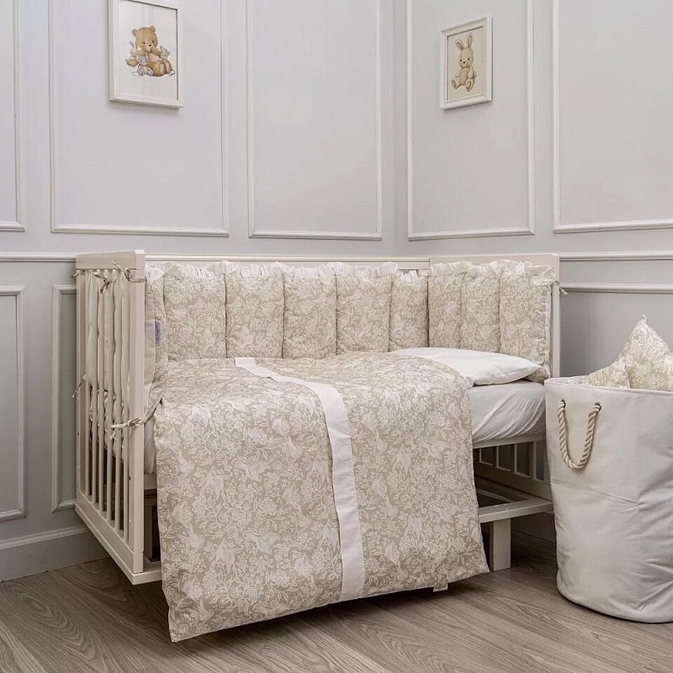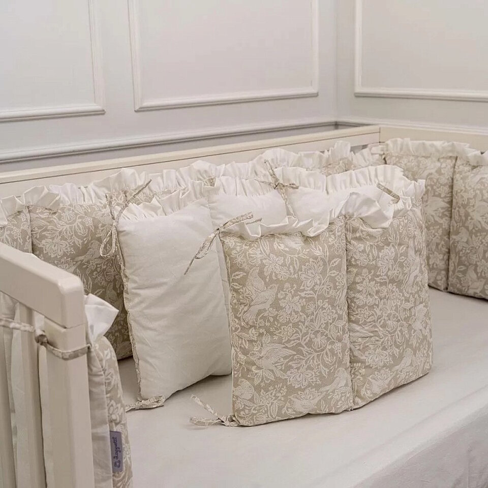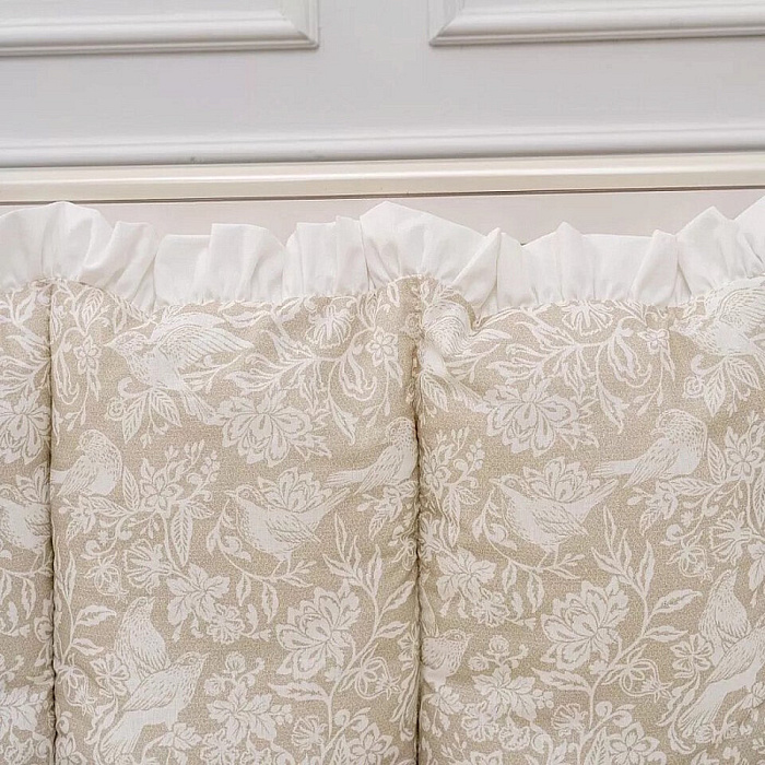 Комплект "Le Jardin" арт.6130 для прямоугольной кроватки - это сочетание нежного поплина авторского дизайна и мягкого вареного хлопка. Он выполнен в нейтральных оттенках бежевого, что делает его универсальным. Особенность данного комплекта - это простеганные бортики на 4 стороны кроватки, украшенные милой рюшкой. Благодаря своей мягкости данный тип бортиков удобен в использовании в различных вариациях.