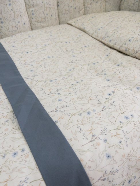 Коллекция "Garden" - это сочетание однотонной "вареной ткани" и ткани из поплина с рисунком. Технология изготовления вареной ткани: готовое полотно стирают в очень горячей воде (практически в кипятке) с добавлением частички вулканической породы и пемзы, в итоге получается природный, натуральный, дышащий материал 100% хлопок, без единого синтетического волокна. Такая ткань дает ощущение прохлады в жару, а в зимние месяцы - согревает и дает уют Вашему малышу. В состав комплекта входят: