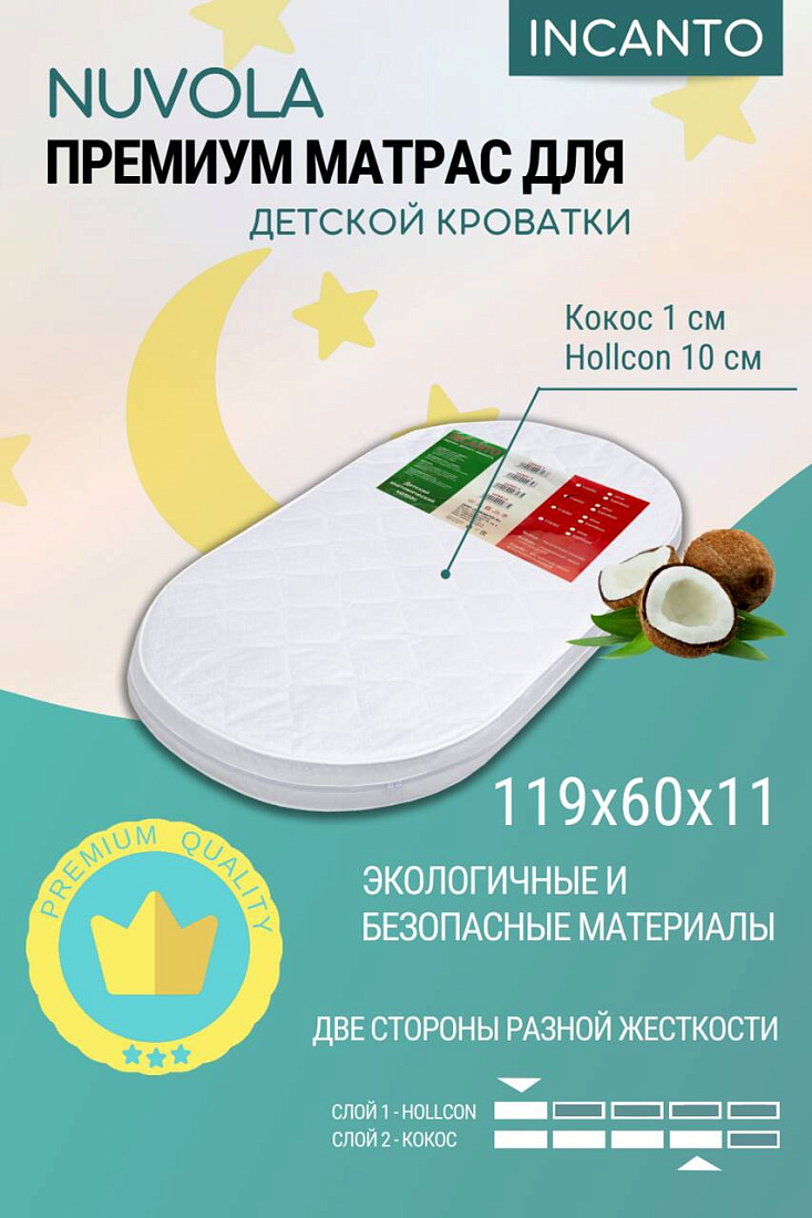 еспружинный ортопедический двусторонний матрас NUVOLA средней степени жесткости. Сторона А — жесткая за счет плиты из многослойной кокосовой койры (1 см), сторона В — «Hollcon» высокой плотности (10 см). Съемный стеганый чехол на молнии (100 % хлопок). Благодаря уникальной структуре и составу холлкон гораздо дольше других наполнителей держит форму и быстрее востанавливает первоначальный объём, не вызывает аллергической реакции. Волокна в ткани соединяются с помощью обработки высокими температурами, без участия клея и других химических веществ, поэтому холлкон является экологически безопасным. Полые волокна, из которых состоит холлкон, отлично сохраняют тепло.