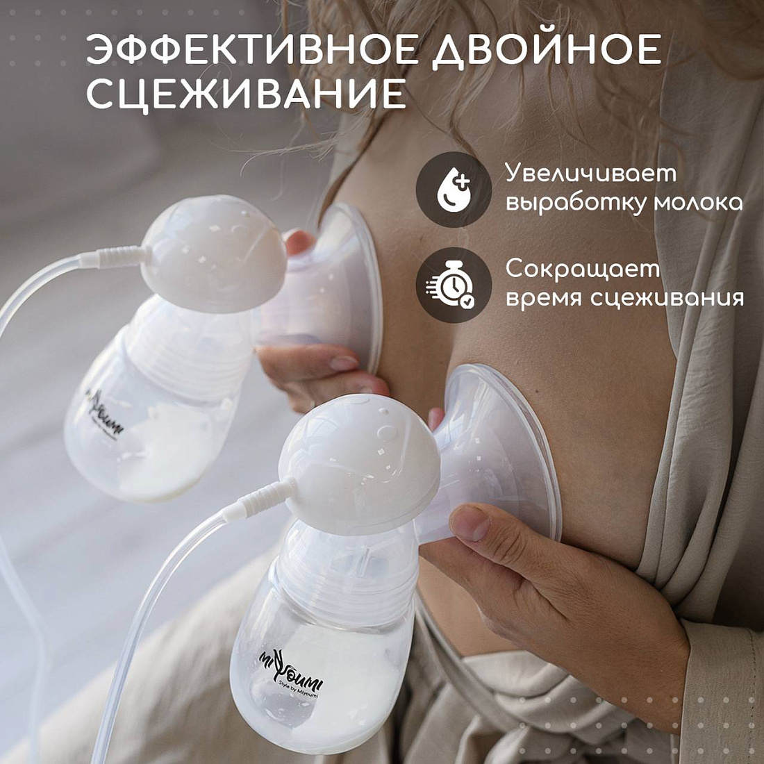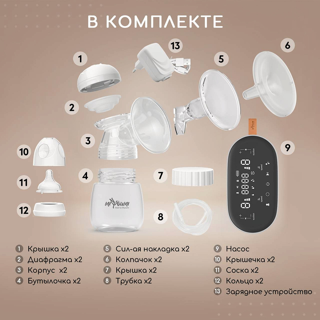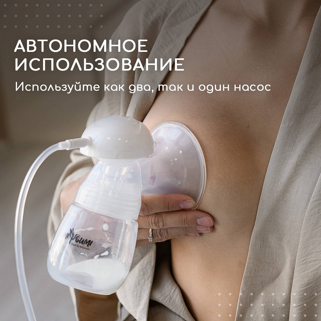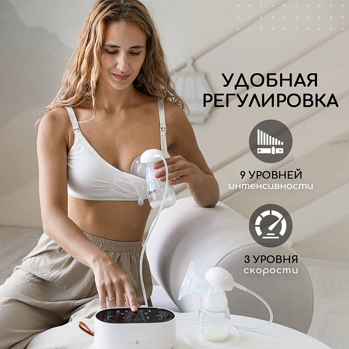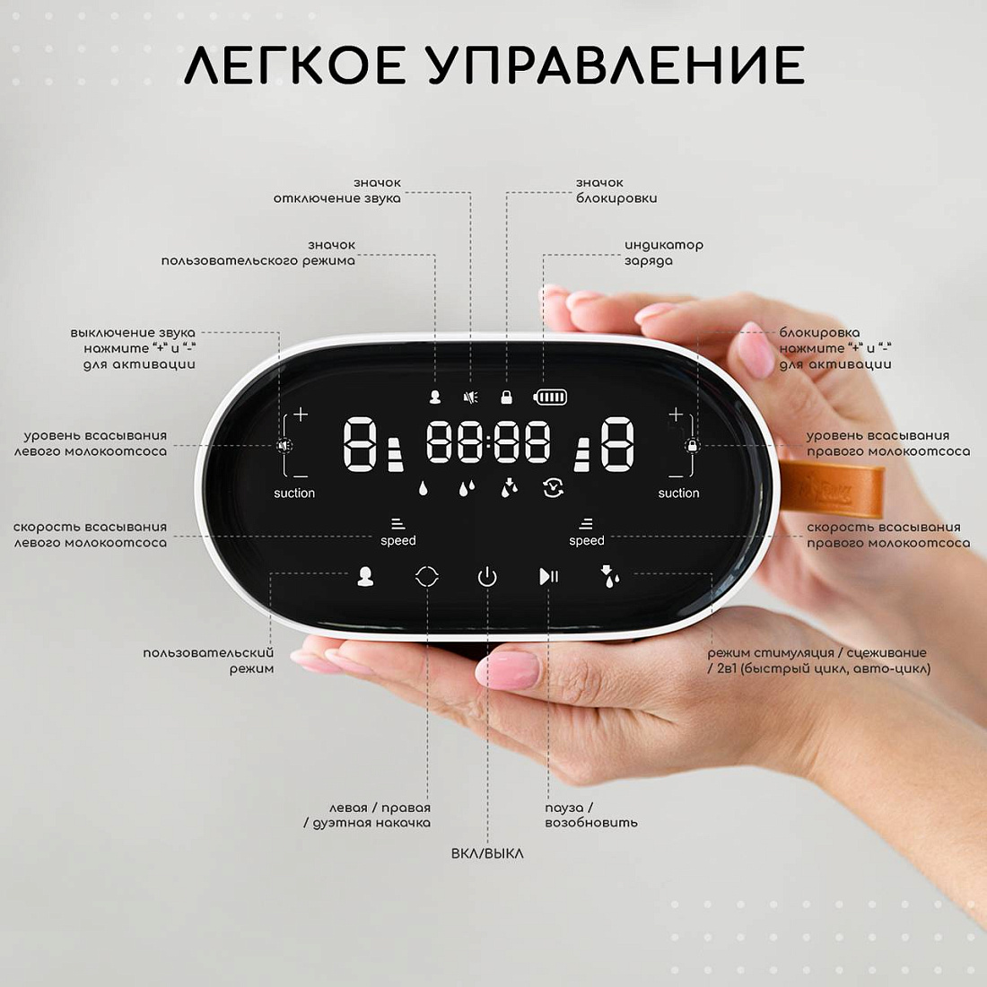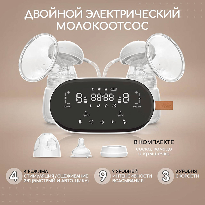 Молокоотсос электрический беспроводной двойной - это лучшее решение для быстрого и безболезненного сбора молока! Очень многие из наших покупателей отмечают, что у них наладилась лактация и сильно прибавилось молока после использования данного аксессуара для кормления. Никаких неудобных проводов и трубок! Очень компактный, вы всегда можете взять его с собой в роддом и использовать в любом месте, на прогулке или в машине. Мощный мотор работает от емкого встроенного литиевого аккумулятора 1200 мАч (до 2,5 часов непрерывной работы), заряжается от всех возможных источников питания через USB. Молокосос имеет не 3, а 4 фазы работы: Массаж, Сцеживание и Смешанный режим для самой чувствительной груди. Каждый режим работы имеет по 9 уровней интенсивности. Вы без труда найдете самый комфортный. За счет функции массажа и полной имитации сосательных движений ребенка, процесс сцеживания происходит быстро и безболезненно. Отлично подойдет для профилактики и предотвращения лактостаза. Воронка с силиконовой окантовкой отлично прилегает к груди, создавая безупречный вакуум, имеет универсальный угол охвата и подойдет для всех размеров груди. Молокоотсос имеет удобный сенсорный блок управления с подсветкой, индикатором заряда, таймером и функцией памяти выбранных ранее настроек. Работает тихо (50 дцб), что позволяет использовать его в любое время суток даже когда рядом спит малыш. Минимум деталей, очень легко разбирать, собирать и мыть. Молокоотсос выполнен из самых современных и безопасных материалов. Никакого неприятного запаха от пластика. Не содержит Бисфенол А. В комплекте бутылочка 180мл из чистейшего пластика PP со стандартным разъемом, которая подходит к большинству известных брендов, таких как Avent , Medela и другие, соска из пищевого силикона, инструкция на русском, дополнительный клапан, гарантийный талон.
