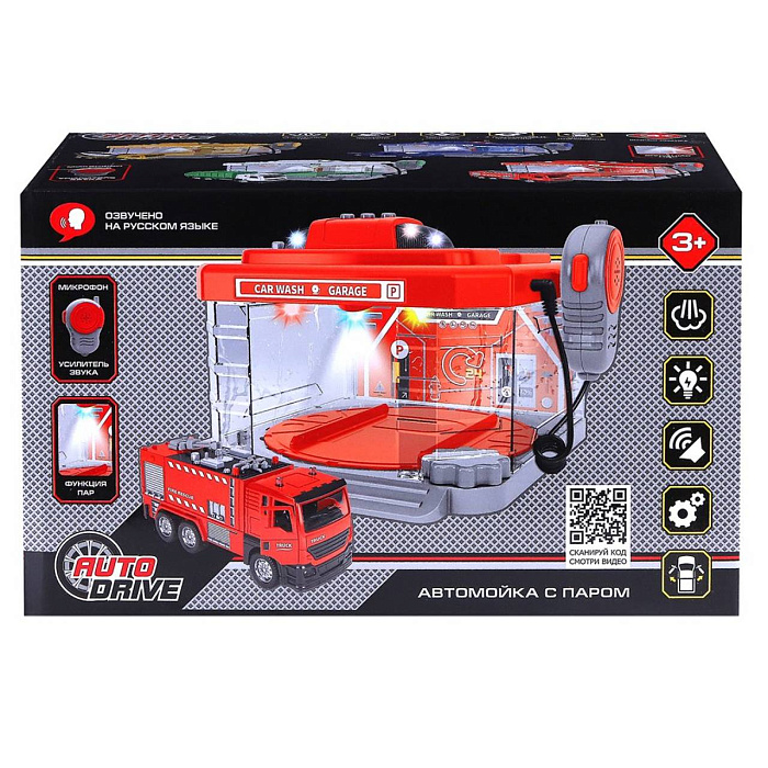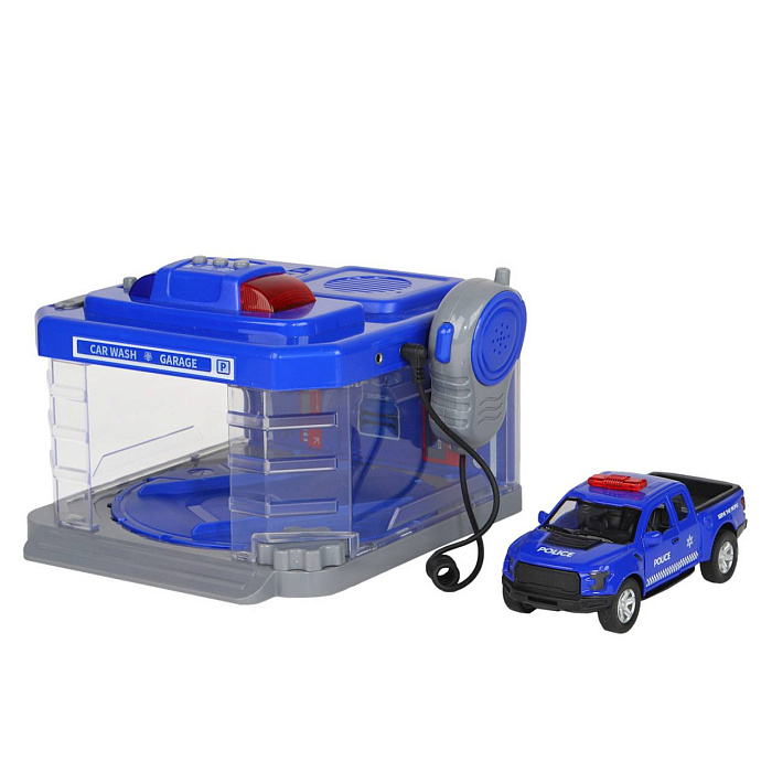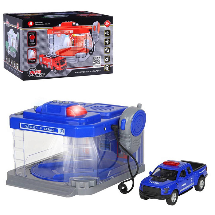 Автомойка с паром «Полиция» торговой марки AUTODRIVE - игрушка, от которой будет в восторге каждый ребенок! Главная особенность игрушки в том, что она генерирует воду в безопасный пар, что создаёт эффект, как на настоящей автомойке. Для этого достаточно залить немного воды в специальный отсек и нажать кнопку пуска пара. Параллельно, при помощи шестеренки, размещенной в нижней правой части игрушки, можно вручную поворачивать платформу, на которой стоит машинка. Игра сопровождается полезными советами на русском языке, звуками транспорта, спецсигналами и световым эффектом от проблескового маячка - за это отвечают функциональные кнопки на верхней части мойки. Микрофон с усилителем звука в виде рации сделает игру ещё интереснее. Ребенок сможет озвучивать процесс игры, а заодно тренировать дикцию. В комплекте с автомойкой идёт металлическая машинка с подвижными элементами.