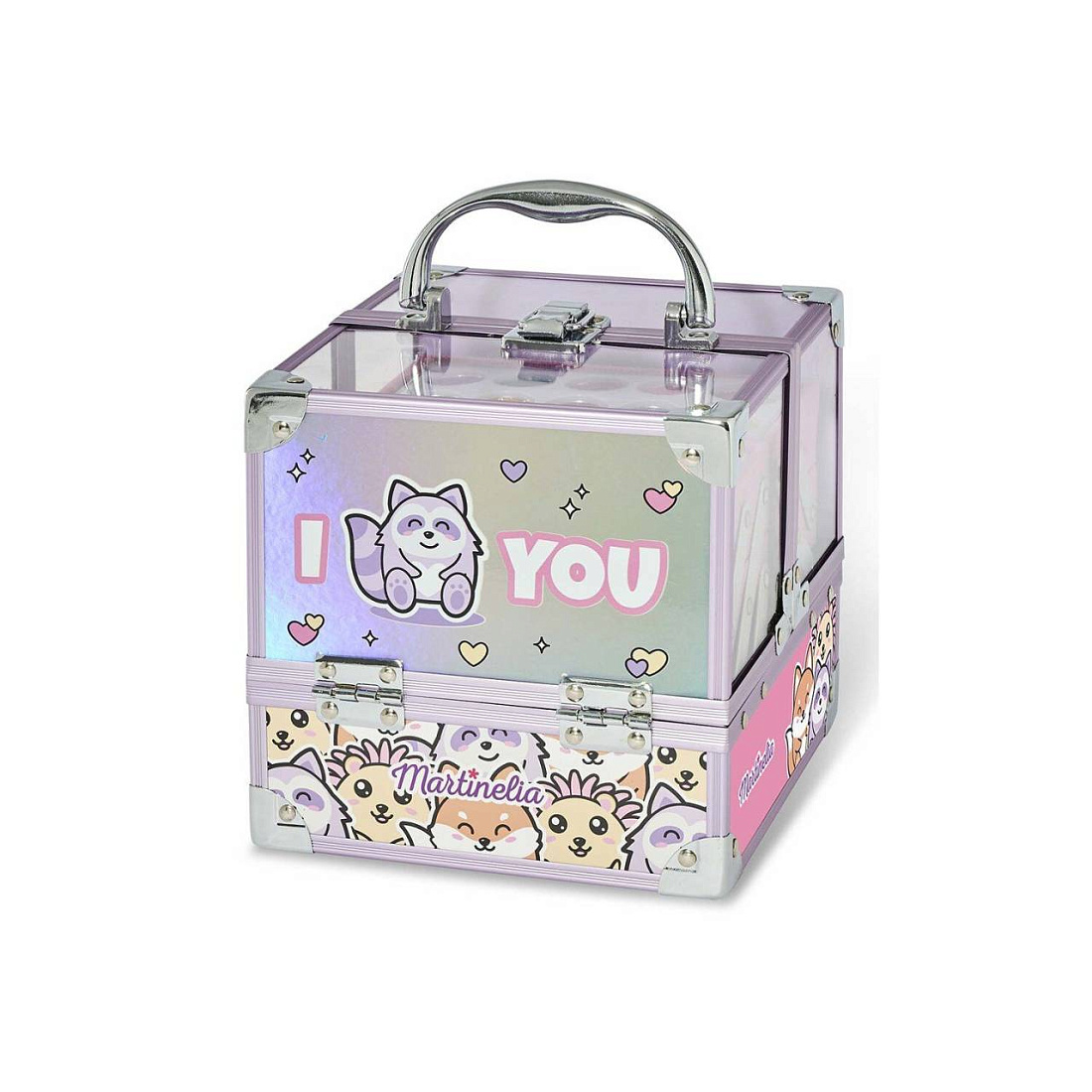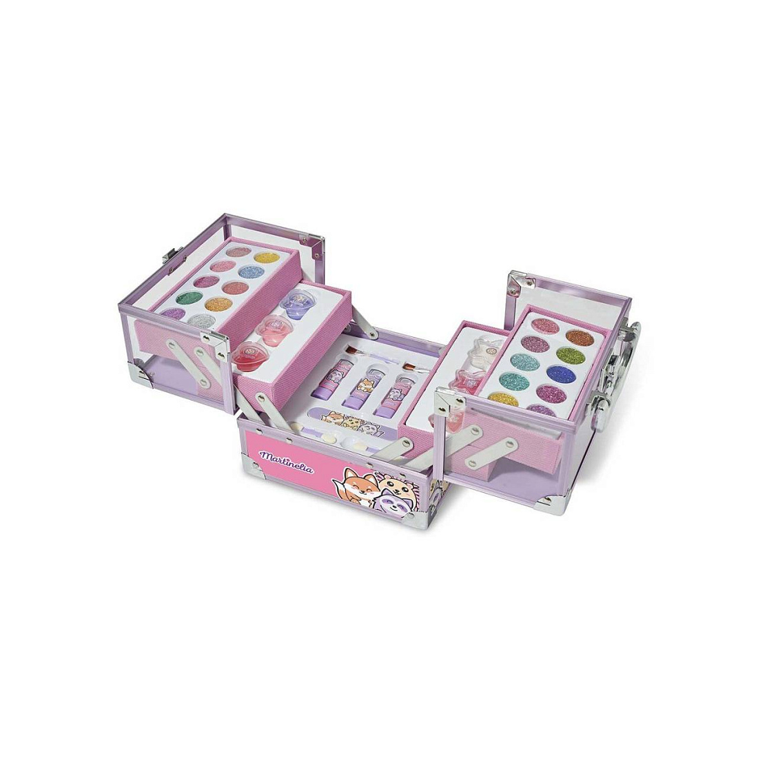 Каждая девочка прекрасна, как аленький цветочек. Детская косметика Martinelia подчеркнет девичью красоту, и в торжественный день маленькая модница почувствует себя неотразимой. Кейс с раскладным механизмом содержит все, что нужно для подготовки к празднику: 20 разноцветных теней и 2 аппликатора, 6 бальзамов для губ, 2 губных помады и 3 блеска для губ. Все оттенки очень красивы и нежны. Косметика безопасна для кожи, не провоцирует аллергию и не требует специальных средств для снятия. Макияж легко смывается водой. Чемоданчик размером 17 х 17,5 х 20 см надежно запирается на замочек.