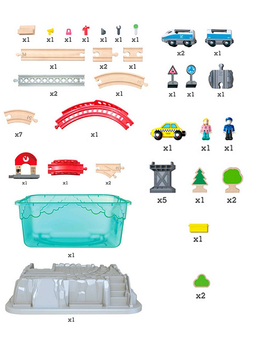 - В набор входят один мост, пять пирсов, одна железнодорожная станция, одно такси, одно кресло, два дорожных знака, одна стойка для инструментов с шестью инструментами, один проводник поезда, один пассажир, три вагона, пять деревьев. Совместим с другими наборами поездов Hape.