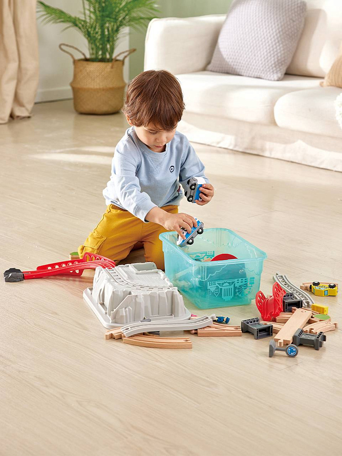 - Комплект поезда поставляется с ящиком для хранения в городском стиле и скалистой крышкой, которая является частью рельсов и декораций с их рельефными дорожками. Упакуйте все внутри для аккуратного и удобного хранения.