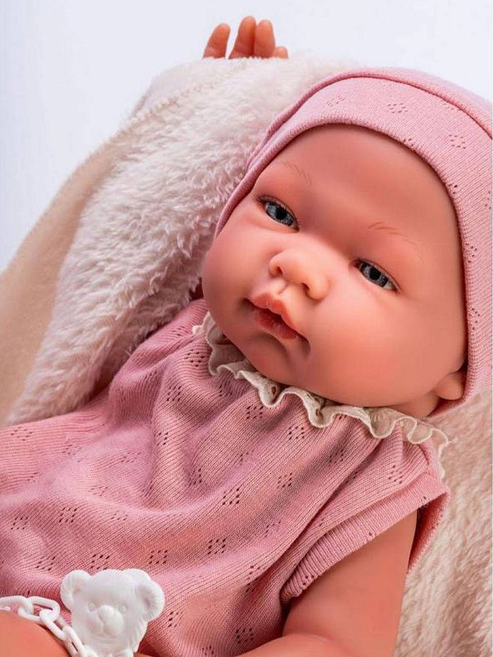У младенца Марии миловидное личико: блестящие голубые глазки с пушистыми ресничками, кругленькие щечки с румянцем, курносый носик, нежно-розовый приоткрытый ротик. Наряды ASI выполнены из высококачественных материалов от ведущих испанских кукольных дизайнеров. Мария одета в красивый дизайнерский комплект: боди пудрового цвета с кружевной отделкой, шапочка и плюшевый плед молочного цвета. В комплекте пустышка с держателем в виде мишки.