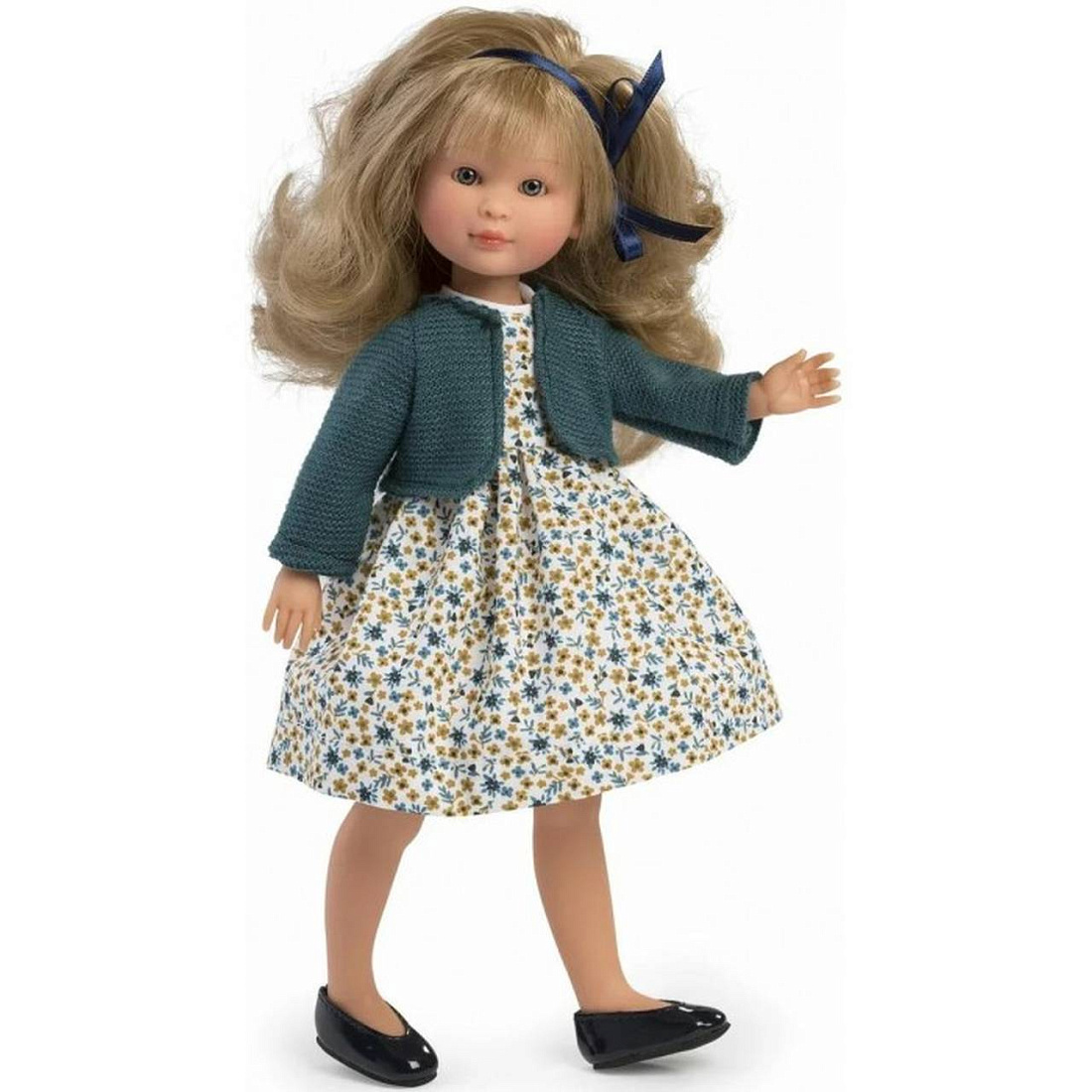 - Одета в красивое цветочное платье и вязаное болеро изумрудного цвета. На ножках лакированные балетки темно-синего цвета. На голове красуется атласная ленточка в цвет ботиночек.
