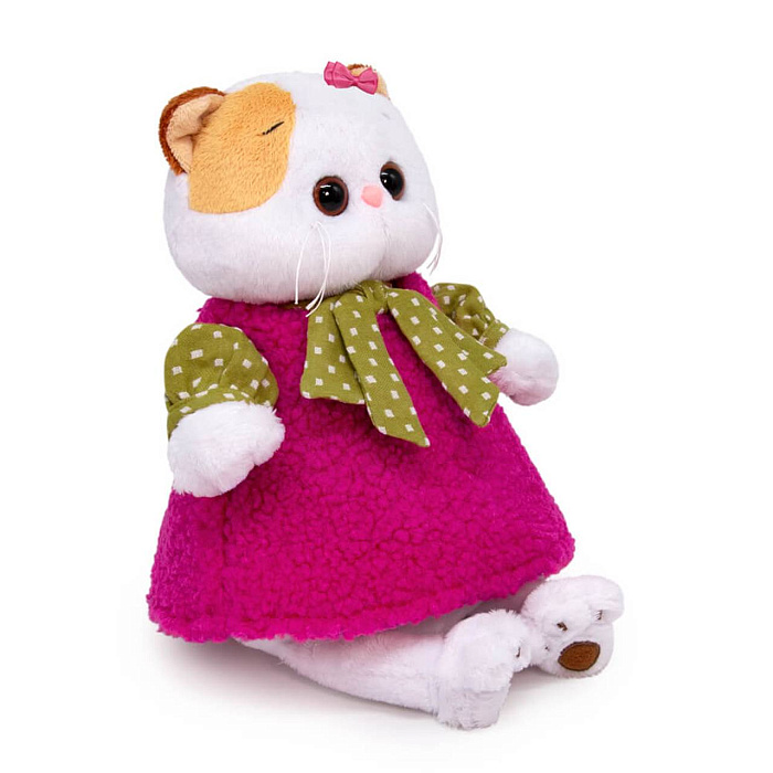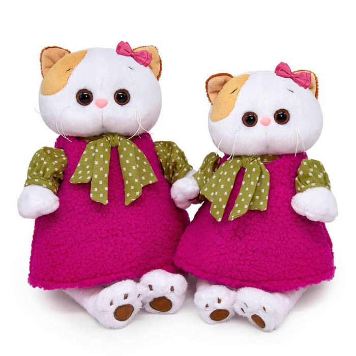 На Ли-Ли милый комплект. Блузка аскот из горчичного хлопка в белый квадратик, с пышным рукавом на манжете. Необычный сарафан простой формы из кудрявого короткого меха цвета красной герани с застежкой сзади на пуговки.