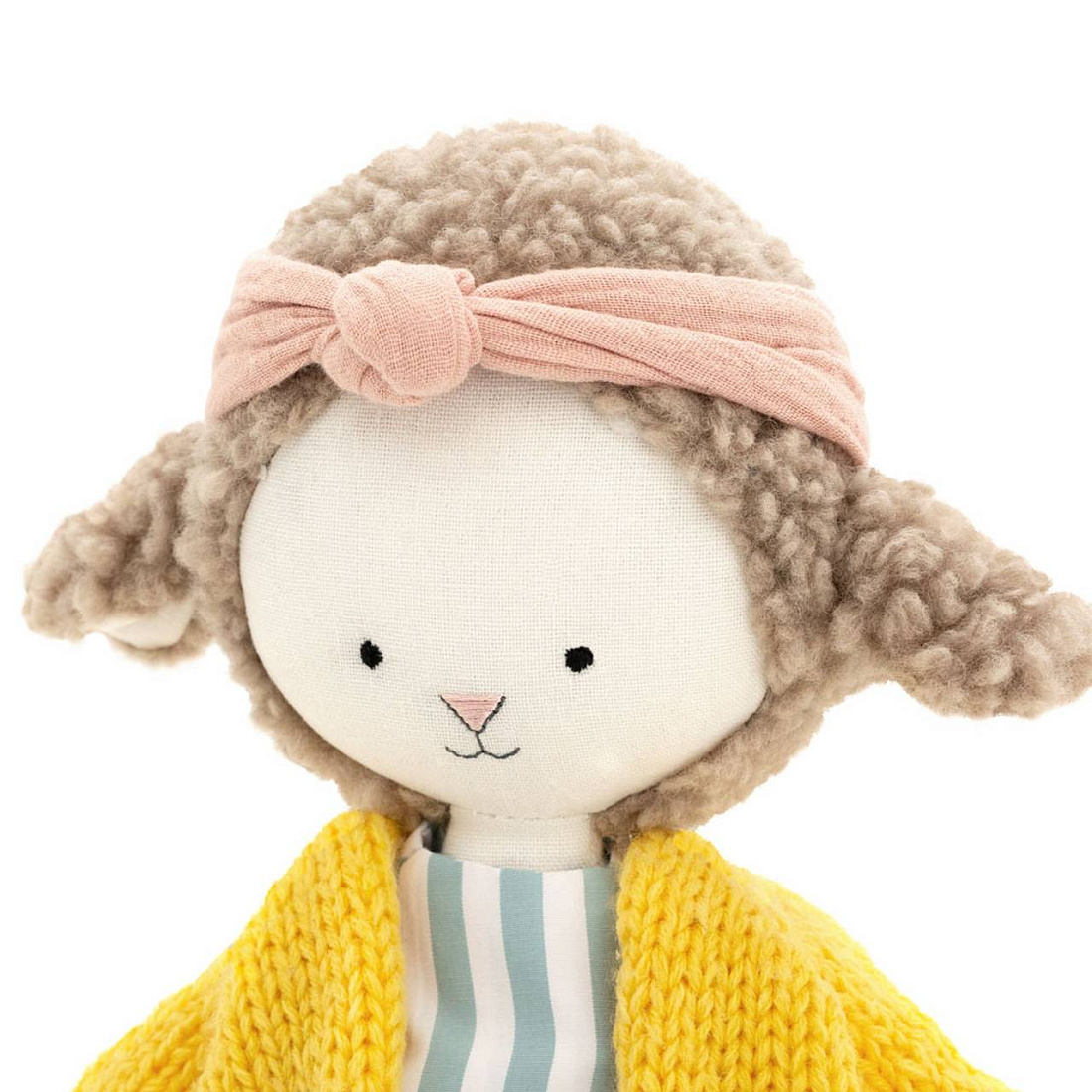 Овечка Зои - самая озорная овечка на свете. Она всегда в хорошем настроении и готова им со всеми поделиться. Зои одета в легкое платье с нежным принтом в полоску и кофту крупной вязки. А пудровая повязка-солоха из муслиновой ткани отлично дополняет образ. Вся одежда Зои полностью съемная.