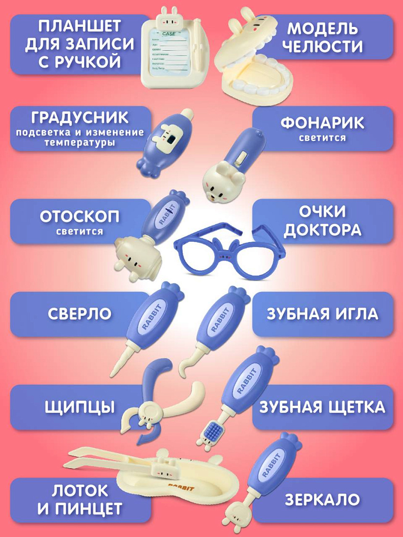Играя с этой игрушкой, малыш легко сможет представить себя врачом, вылечить своих друзей, любимые игрушки или открыть клинику для игрушечных пациентов. Игра поможет ребёнку преодолеть страх перед врачами.