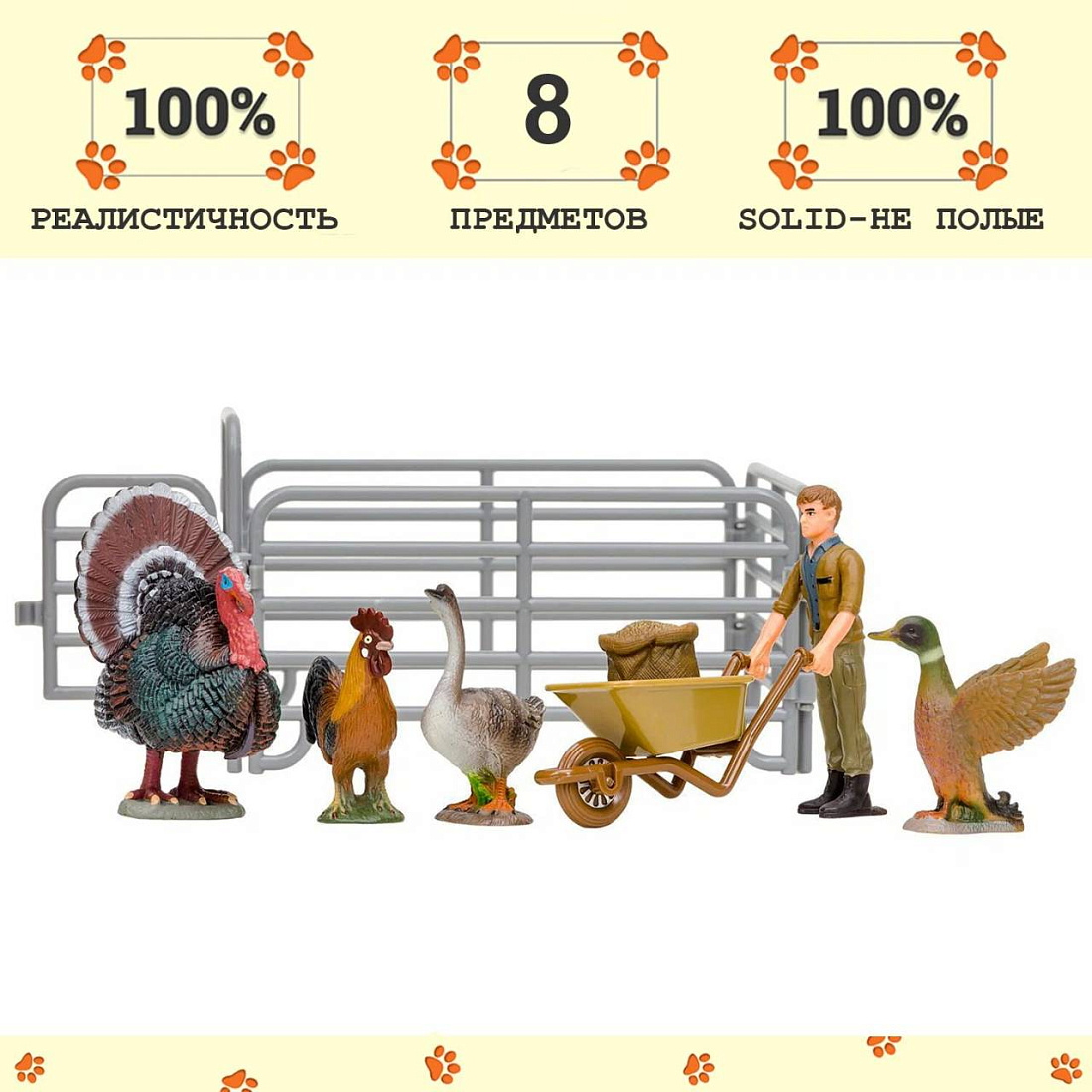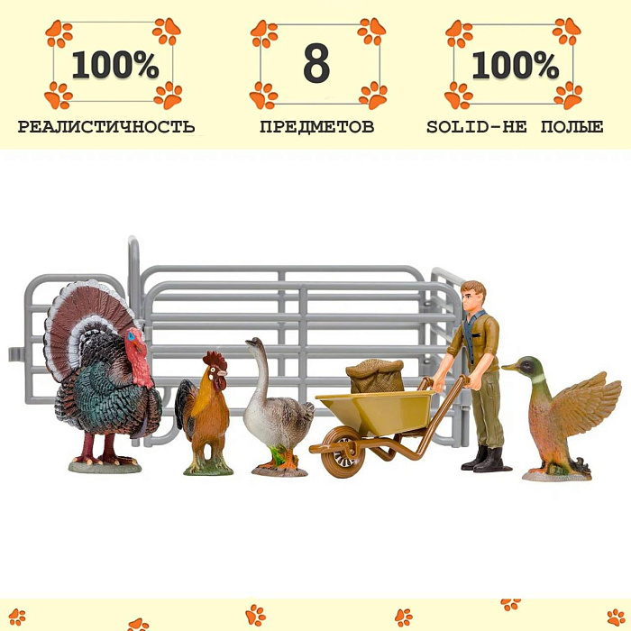 Игрушки фигурки в наборе серии "На ферме", 8 предметов (фермер, индюк, петух, гусь, утка, ограждение-загон, инвентарь)