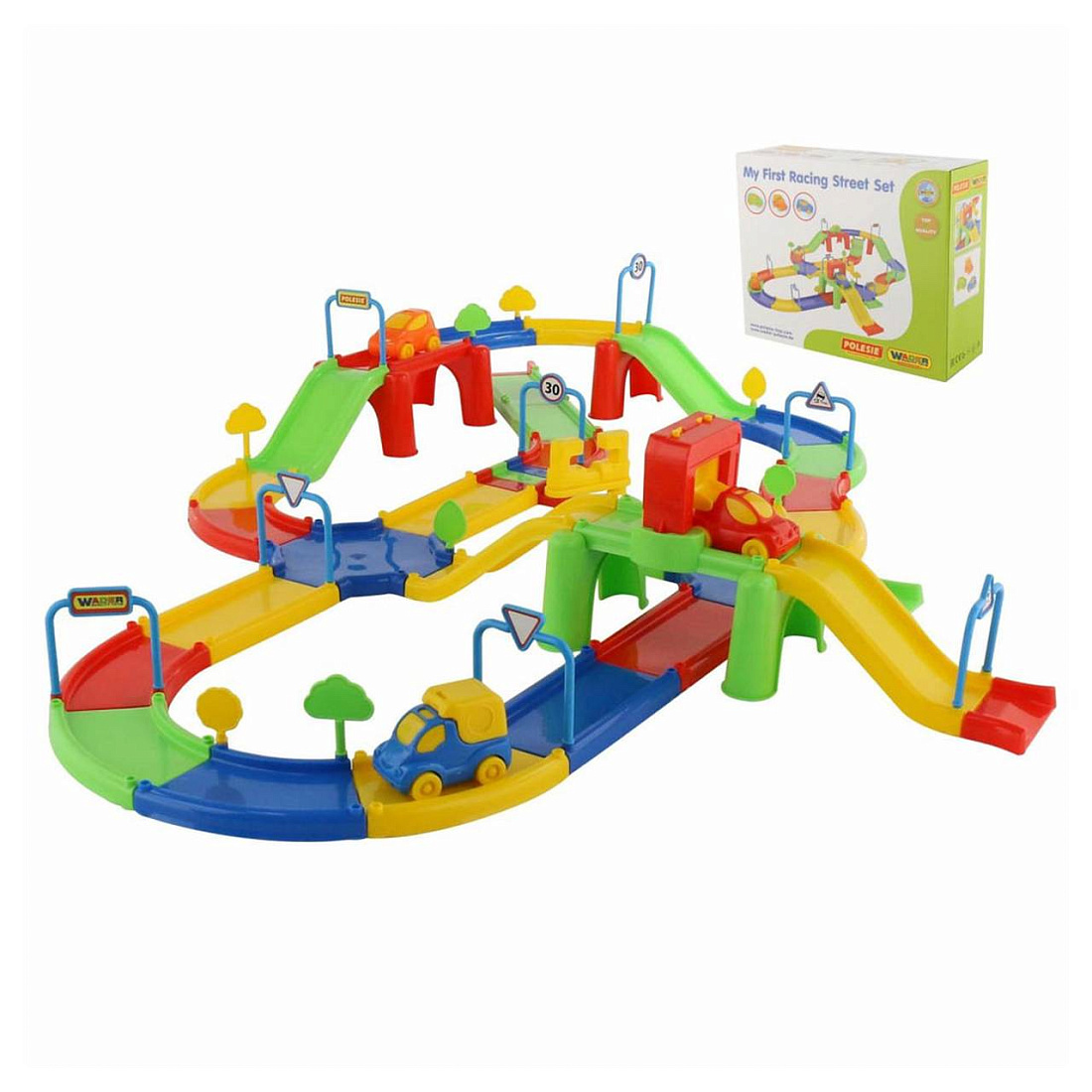 В комплекте с треком идут: 8 дорожных знаков, 8 деревьев, 3 автомобиля, а также наклейки. Гоночный трек собирается из 64 элементов, позволяющих дополнительно создать автомойку и автозаправку.