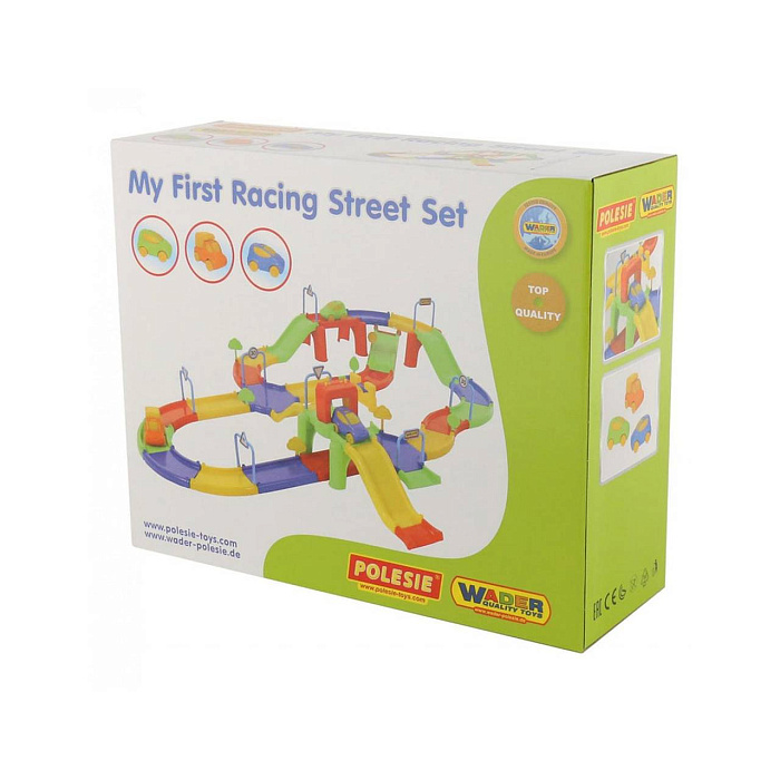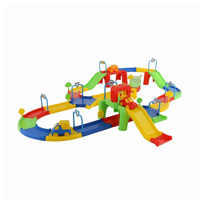 Игровой комплекс представлен в виде яркого сборного гоночного трека. Все элементы имеют округлую форму деталей и выполнены из качественных материалов, благодаря этому игрушка максимально безопасна.
