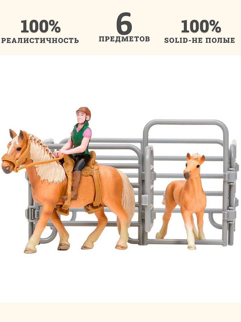 Игрушки фигурки "На ферме", 6 предметов: Авелинская лошадь и жеребенок, наездница, ограждение-загон, инвентарь