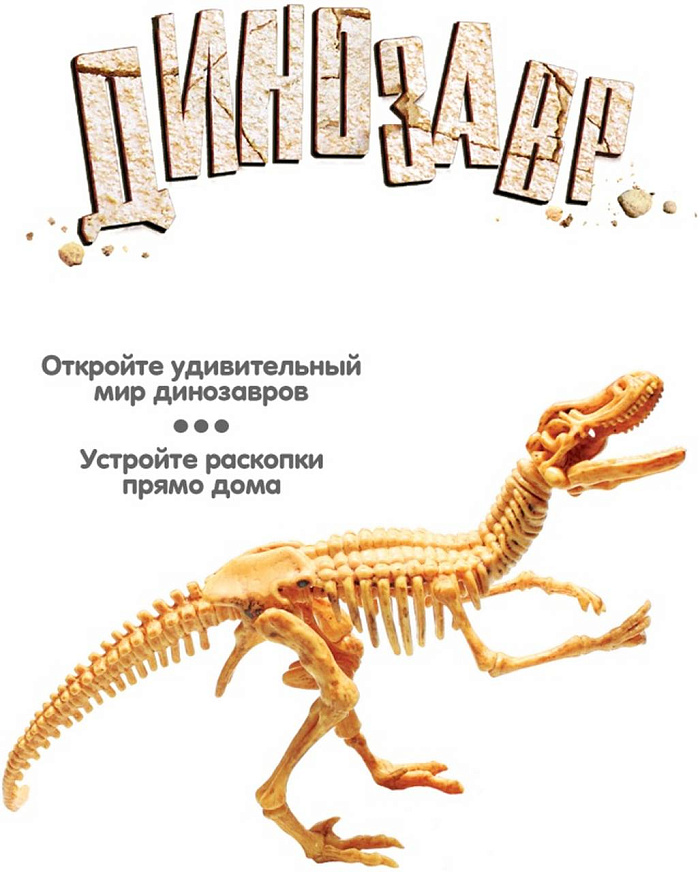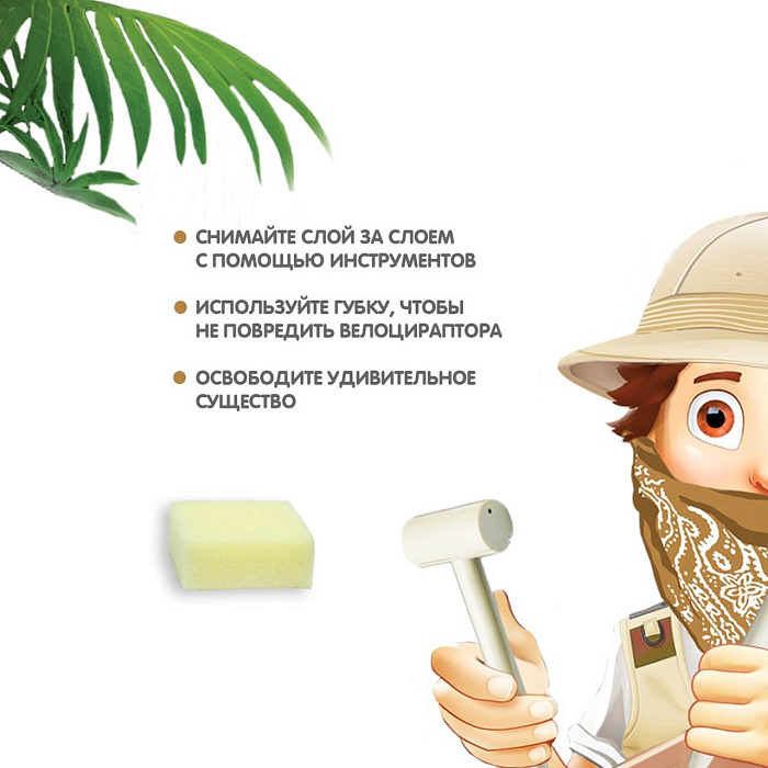 - блок для проведения раскопок, молоток, зубило, кисточка, губка, скелет, инструкция.