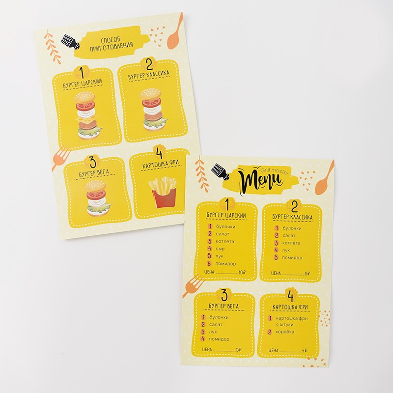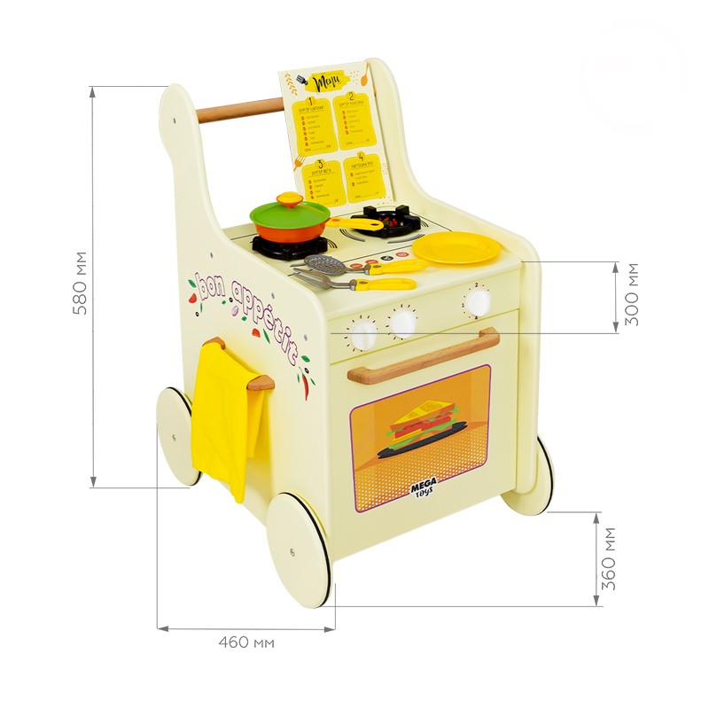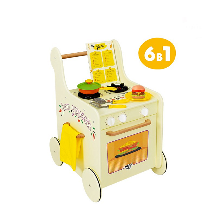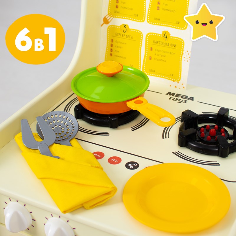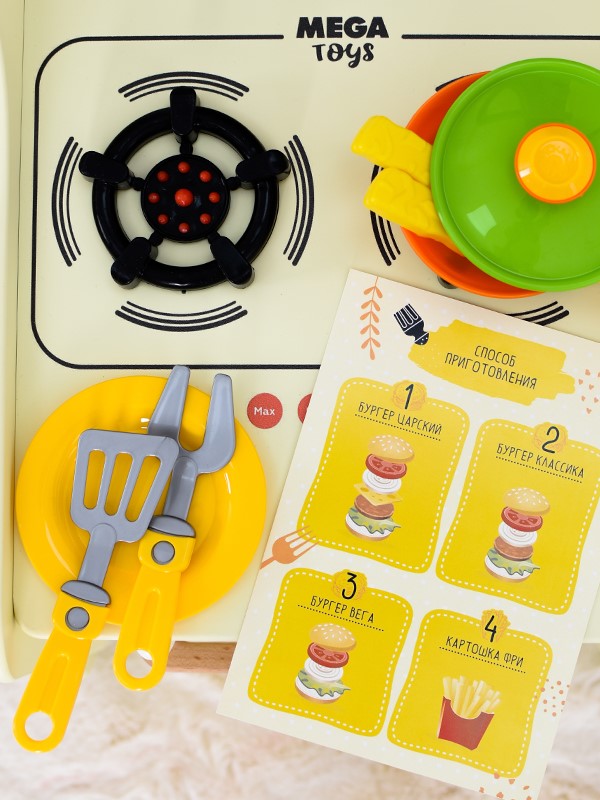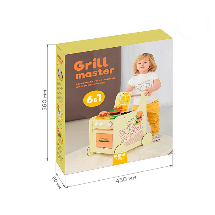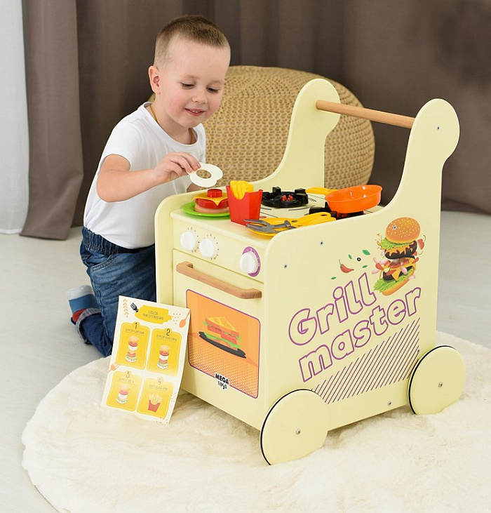 Кухня-каталка GRILL MASTER — это настоящий передвижной ресторан на колёсах! Реалистичный дизайн прекрасно подойдет для сюжетно-ролевых игр и обязательно понравится детям. Это увлекательная игра и активное развитие для малыша, а также безграничные эксперименты на кухне! Стань настоящим шеф-поваром, погрузившись в увлекательный процесс интересной игры. Подходит для коллективной игры группой детей. На корпус нанесён стильный тематический принт. Варочная поверхность имеет 2 объёмные конфорки с имитацией горящих огоньков. На панели управления расположены 3 поворотных ручки, которые вращаются и имитируют включения газа. Дверка духового шкафа открывается и оснащена механизмом с фиксатором открывания. Колёса имеют резиновый обод для бесшумной езды и удобного проката по различным поверхностям напольных покрытий. Меню, входящее в комплект, позволяет разнообразить игру — принимай заказы, готовь по рецептам меню, придумывай новые блюда, экспериментируй на кухне и будь лучшим шеф-поваром ресторана. Данные игры способст