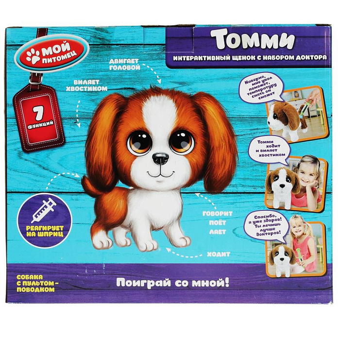 Этот очаровательный щенок совсем как настоящий. У Томми красивые глазки и умилительная мордочка. Бежевая с белым шёрстка щенка очень приятная на ощупь. Милая игрушка подарит малышу массу положительных эмоций и научит заботиться о домашнем любимице.