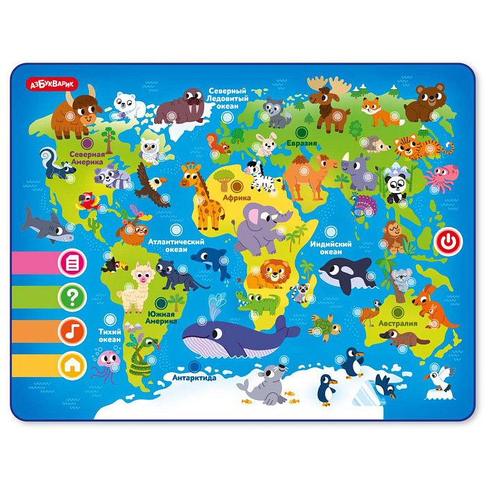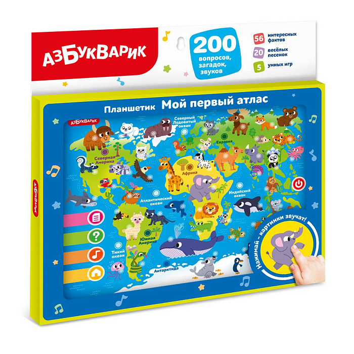Планшетик «Мой первый атлас» - это настоящая говорящая карта мира для детей! Все картинки – говорящие! Нажимая на них, ребенок познакомится с животными, материками и океанами, послушает голоса и забавные звуки! Кроме того, ребенок сможет послушать 56 интересных фактов и 5 познавательных песенок («Вокруг света», «В джунглях», «В саванне», «В лесу», «Животные нашей планеты»)!