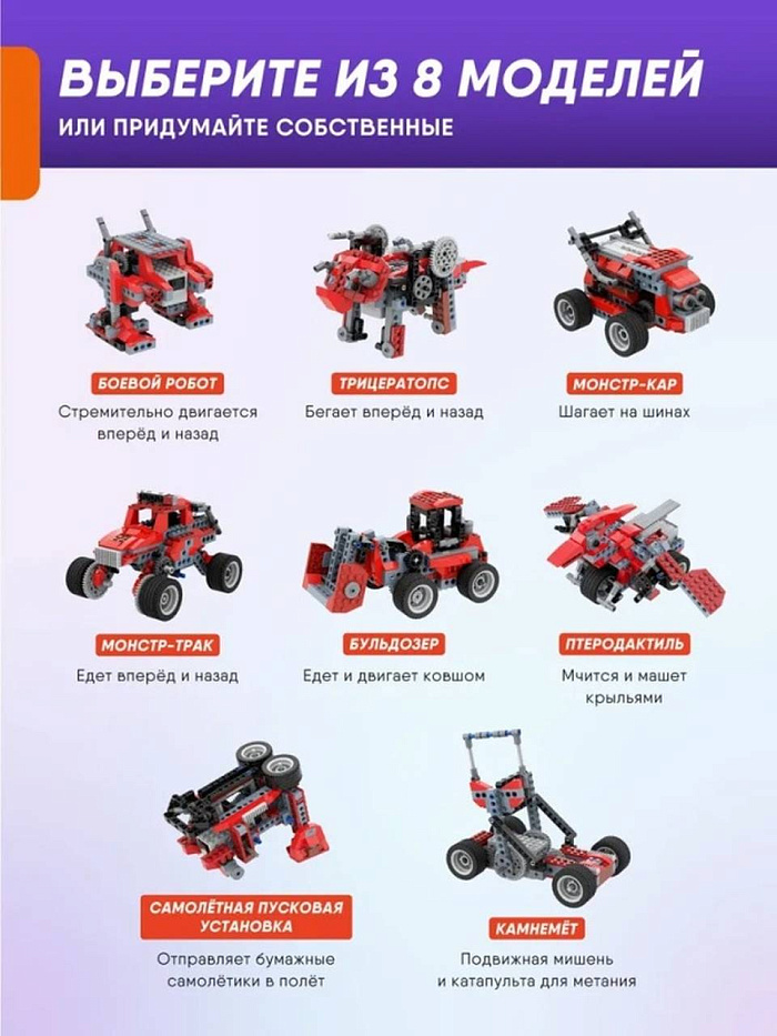 – Программируемый Scratch конструктор – электронный. При сборке выбирайте из 6 готовых моделей или создавайте собственные с нуля.