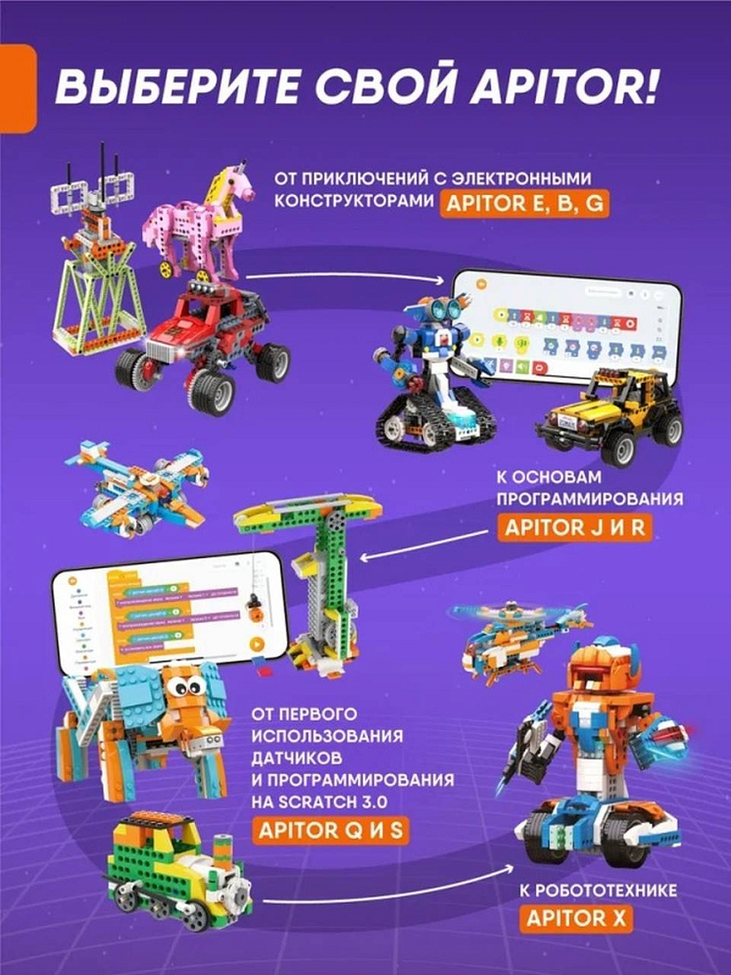 Набор Robot J познакомит ребёнка 7, 8, 9, 10 лет с основами программирования в Scratch Junior и робототехникой, поможет развить пространственное мышление и воображение, вдохновит на творчество. А ещё он станет прекрасным подарком на день рождения, Новый год, 23 февраля и другие значимые события, как для девочки, так и для мальчика. Освойте скретч программирование с конструктором Apitor. Интересно будет даже родителям!