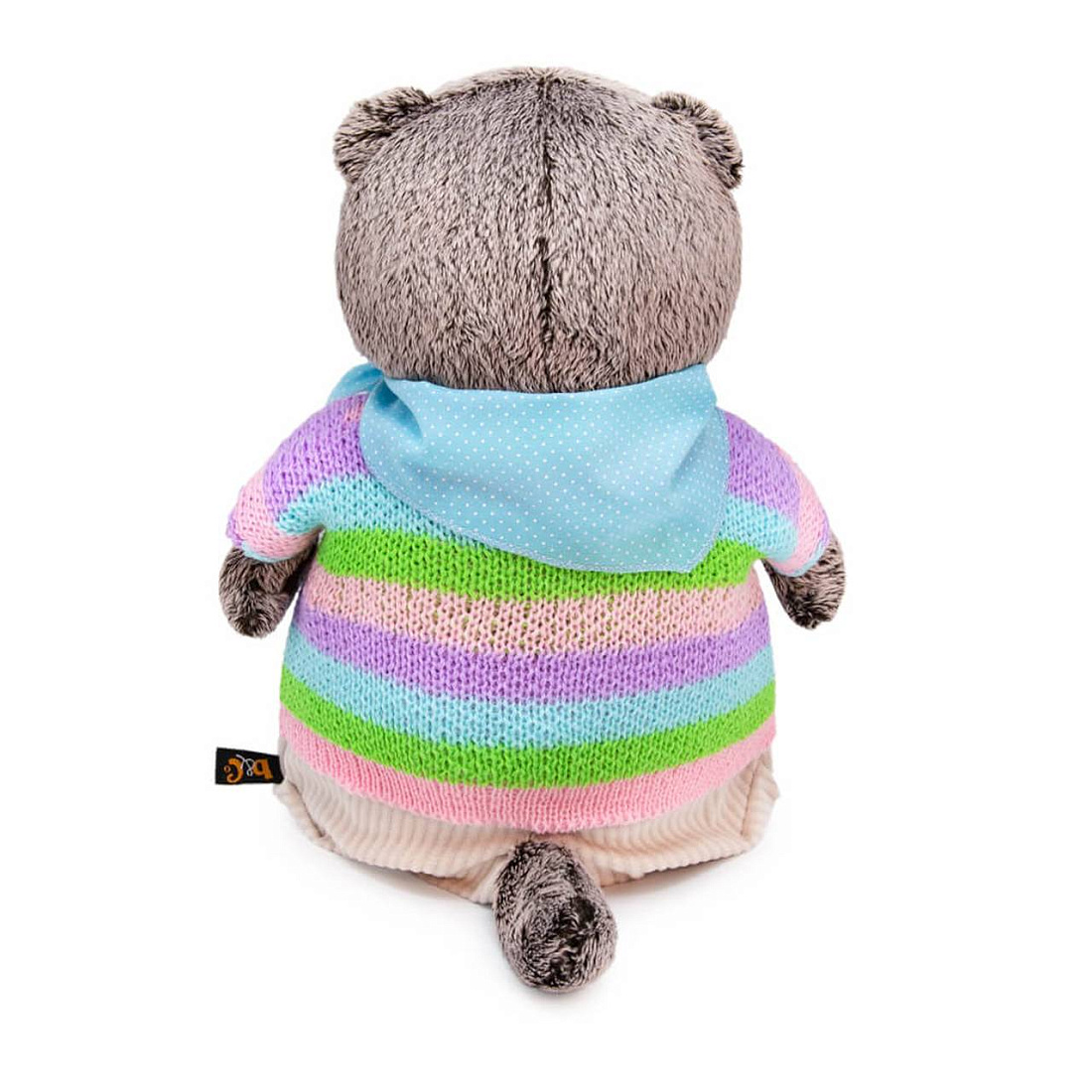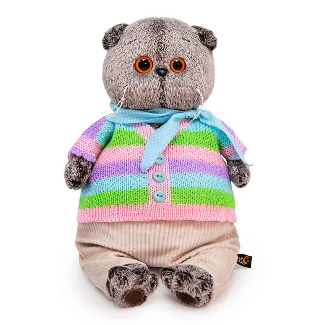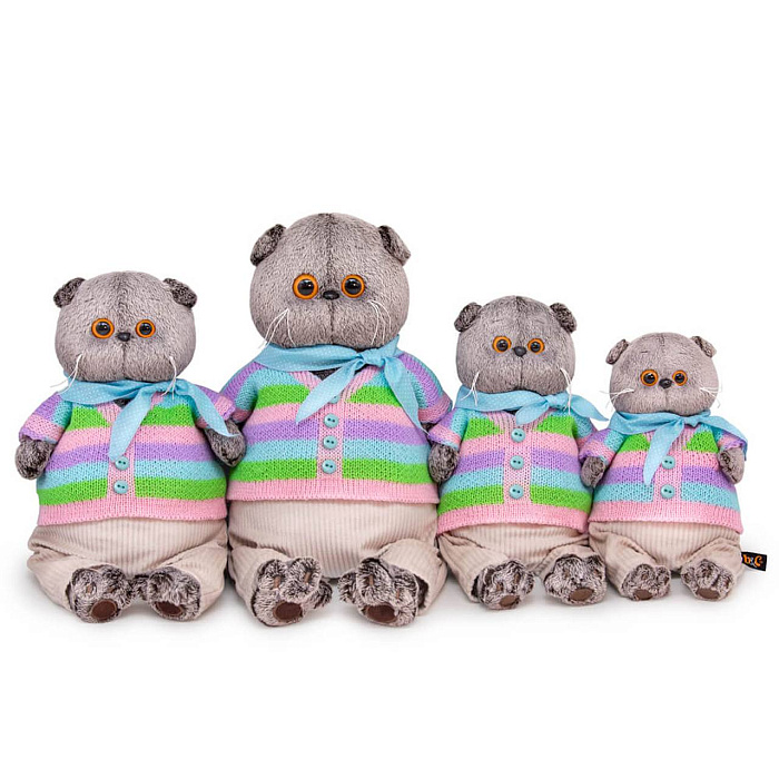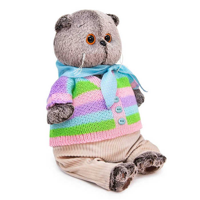 Игрушка мягкая КОТ БАСИК в полосатой кофте и штанах 22 см. Кот в непринужденном комплекте. Полосатый свитер необычного дизайна, связанный в виде кофты на пуговках. Уютные штанишки из мягкого вельвета цвета экрю. И завершает комплект шейный х/б платочек нежноголубого цвета в мелкий белый горошек.
