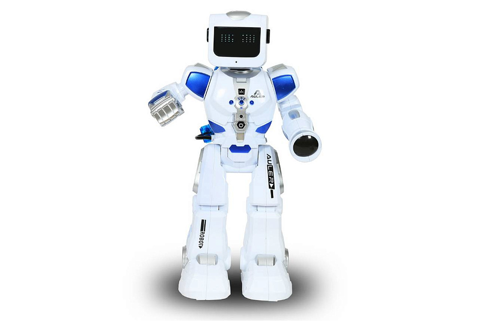 - Интерактивная игрушка выглядит, словно фантастический робот в детально проработанной броне и шлеме белого цвета с голубыми вставками.