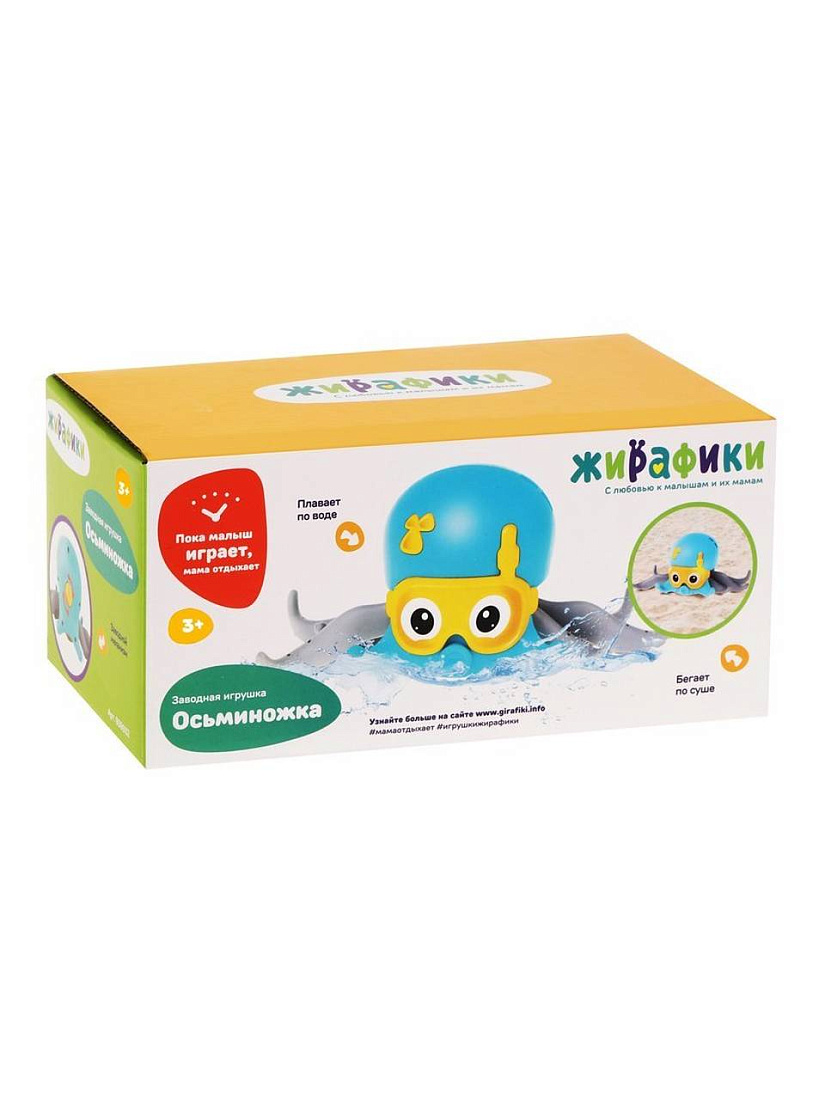 С таким милым осьминогом купание станет еще веселее и интереснее! Заведите игрушку, и она шустро поплывет по воде, перебирая своими щупальцами. Но и на суше осьминог не даст малышу скучать. Поставьте осьминожка на пол, и снова заведите игрушку – осьминог быстро побежит по полу! А еще у осьминожки есть колеса, и малыш может возить его за собой за веревочку!