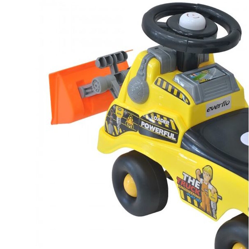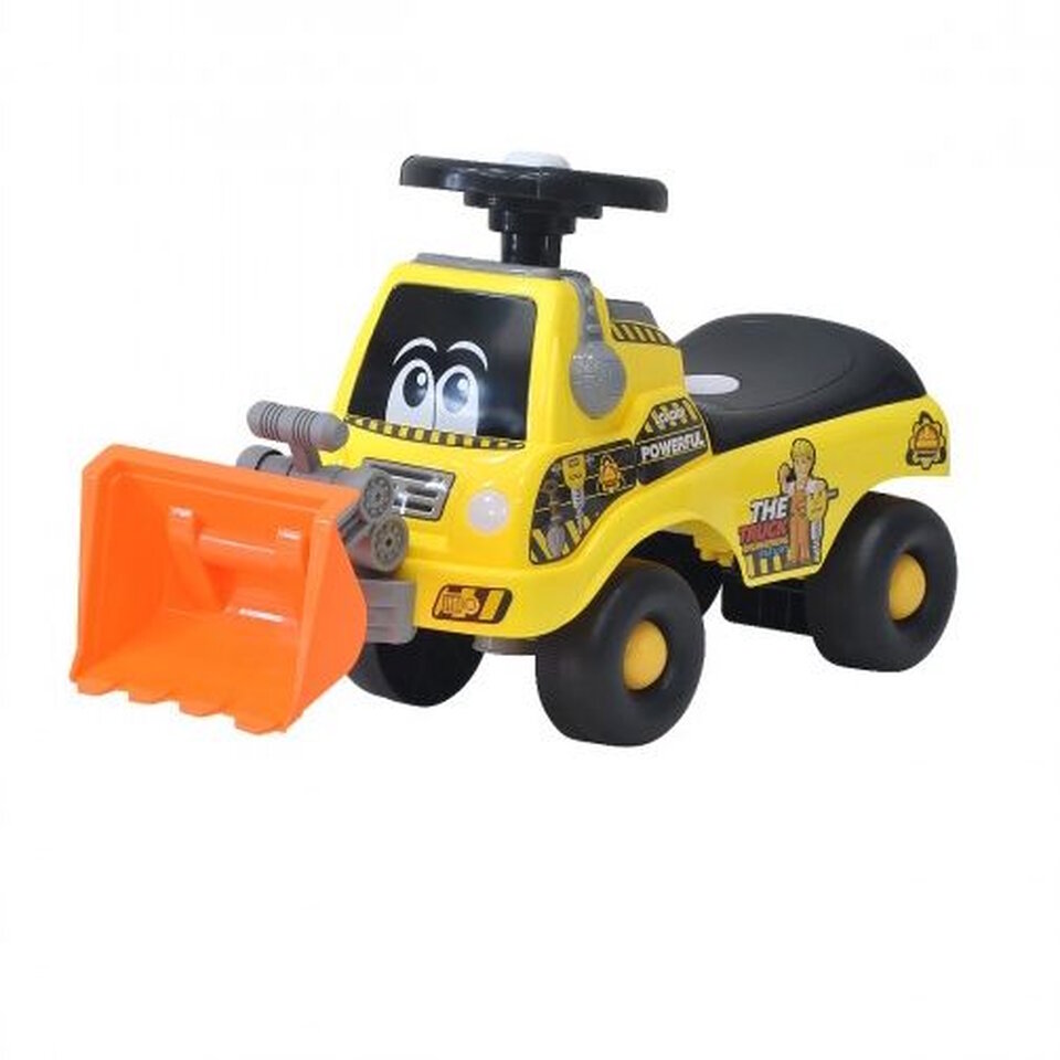 Преимущество этой модели в наличии ковша, который расположен впереди машины. Им можно загребать землю, песок или перевозить игрушки. На руле расположен сигнал - пищалка. Каталка не имеет острых углов, и полностью безопасна для ребёнка. При производстве каталки используется только высококачественное сырьё соответствующее европейским стандартам.