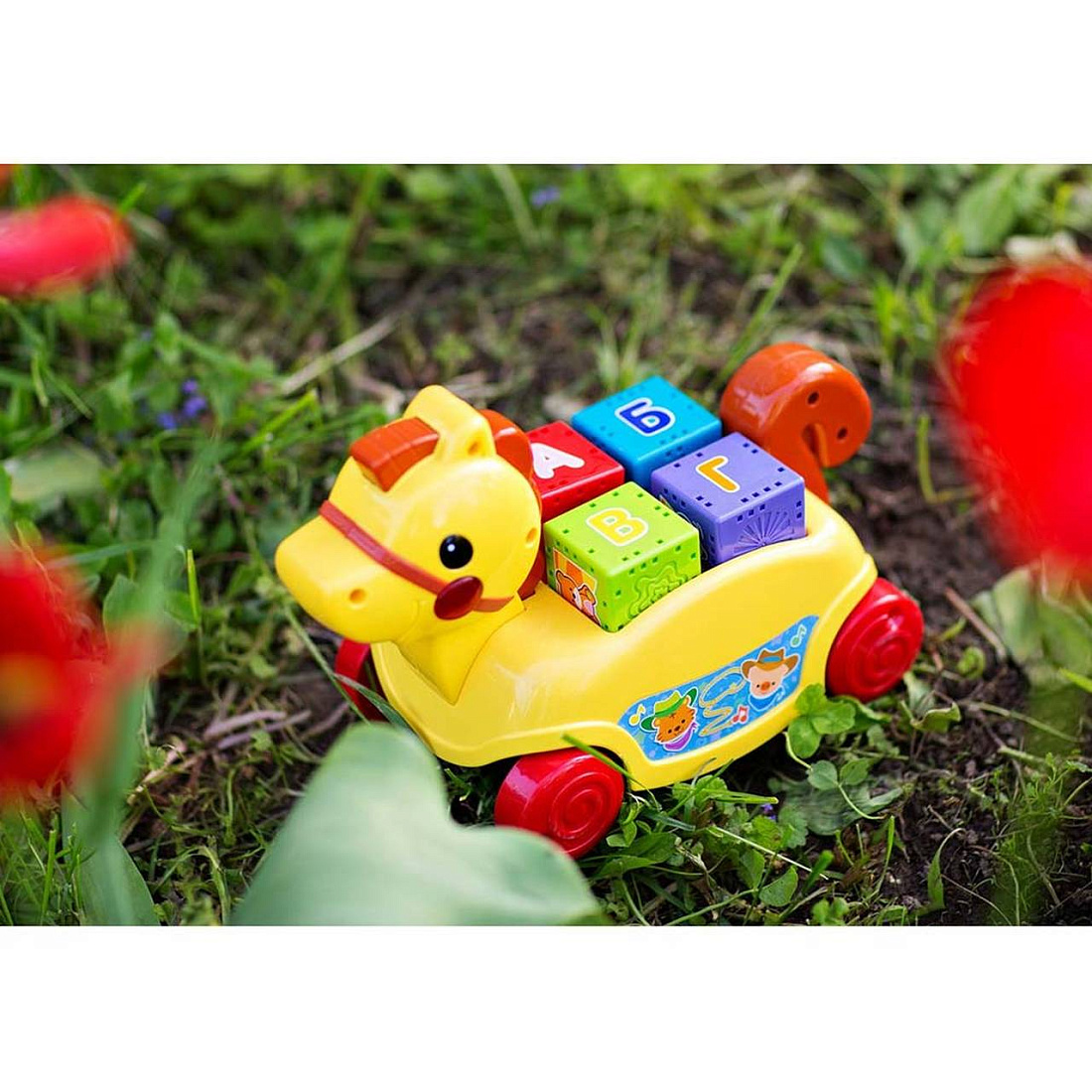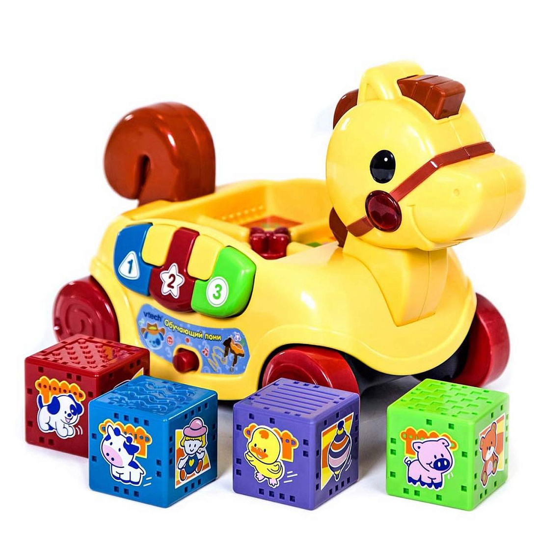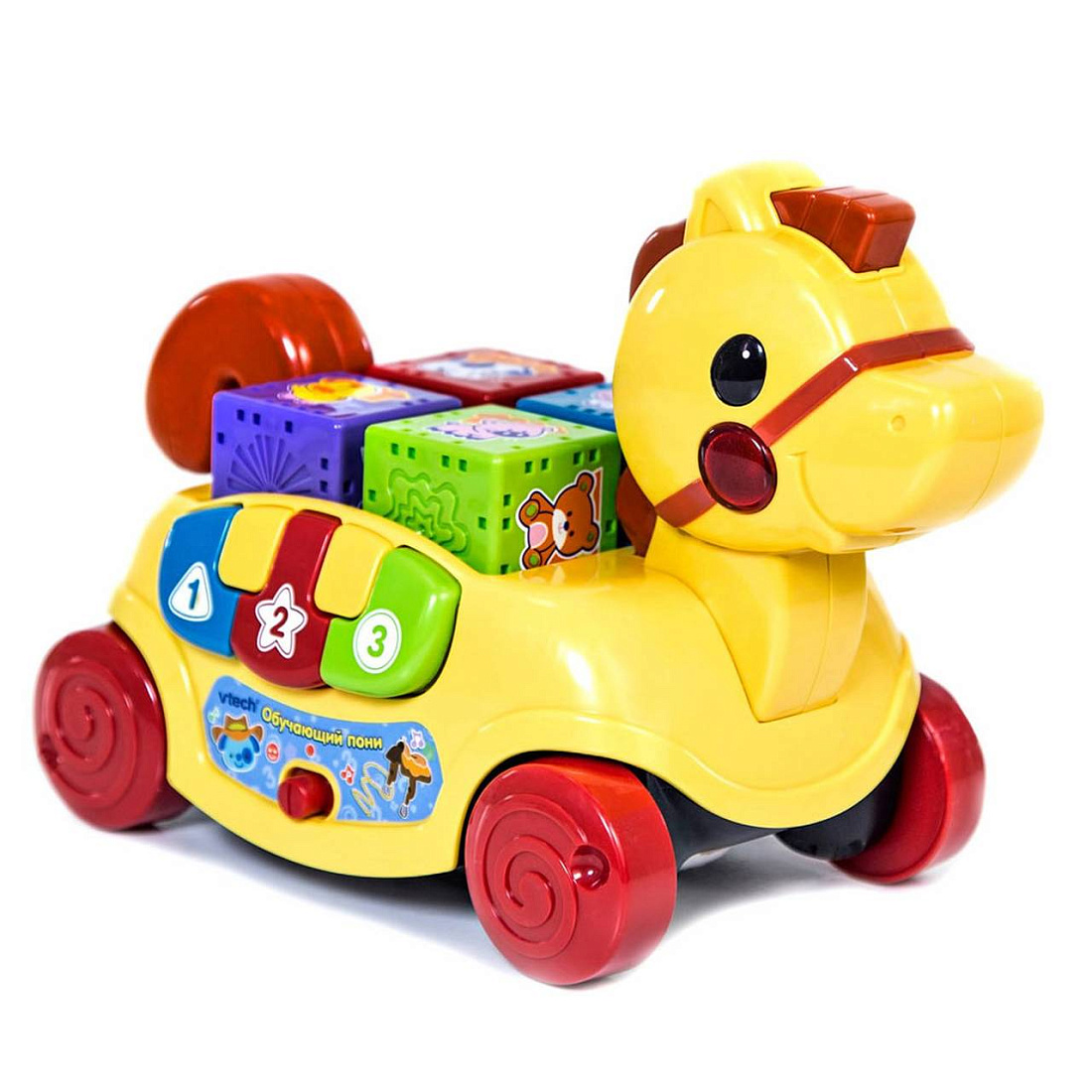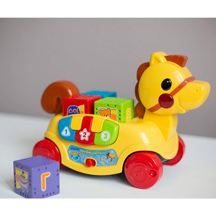 - Игрушка имеет множество интересных обучающих элементов. Спинка пони вмещает 4 крупных кубика различных цветов: фиолетового, голубого, салатового и красного. Гран