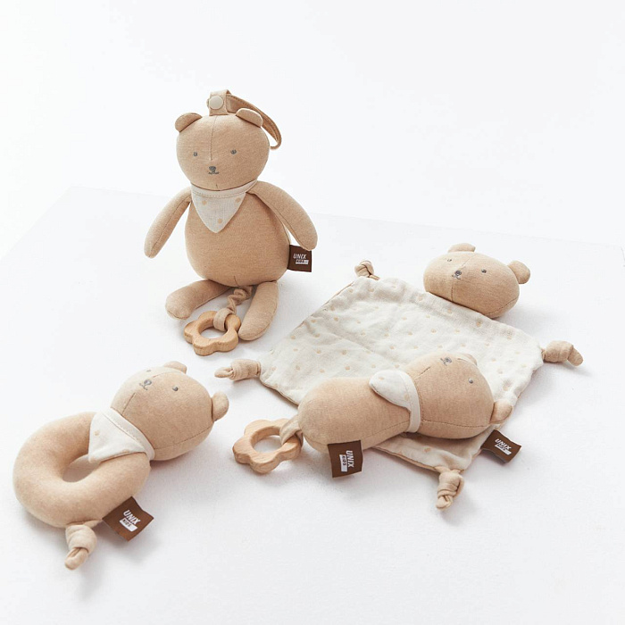 Набор UNIX Kids Хлопковый медведь / Cotton Bear - это полезные развивающие игрушки до года, специально созданные для младенцев с первых дней жизни. Продукт разработан с учетом потребностей ребенка и способствует гармоничному развитию и комфортному отдыху новорожденного. Набор включает четыре уникальных изделия: мягкую подушку - комфортер, прорезыватель - погремушку, погремушку с кольцом и музыкальную подвесную игрушку - прорезыватель.