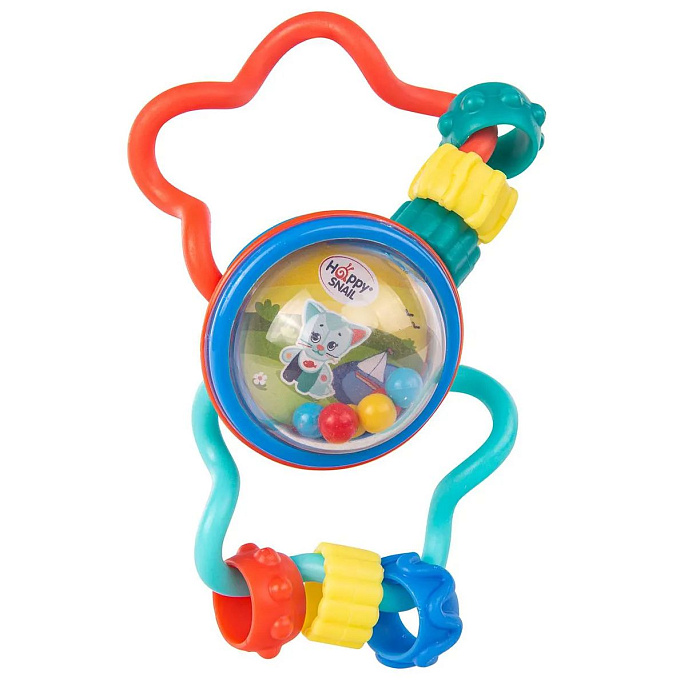 Погремушка Котик Дарси от Happy Snail в виде круглого шара с удобными мягкими ручками понравится любому карапузу. Игрушка изготовлена из твердых и мягких деталей, ее ручки гнутся, поэтому малышу захочется их погрызть, когда начнут прорезываться зубы. На мягких ручках - разноцветные колечки, которые можно передвигать, стимулируя мелкую моторику рук, а внутри шара - бусины и изображение персонажа котика Дарси. Звук погремушки мягкий, не навязчивый. Цвета погремушки яркие и контрастные, это стимулирует развитие визуальных навыков и изучение цветов.