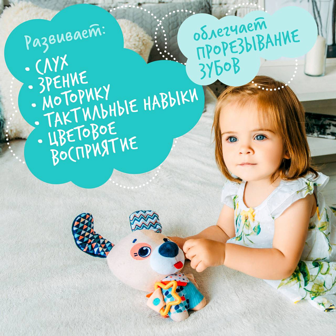 - Благодаря этой игрушке, напоминающей забавного щенка, ребенок сможет развивать зрение и слух, улучшит тактильные навыки и мелкую моторику.