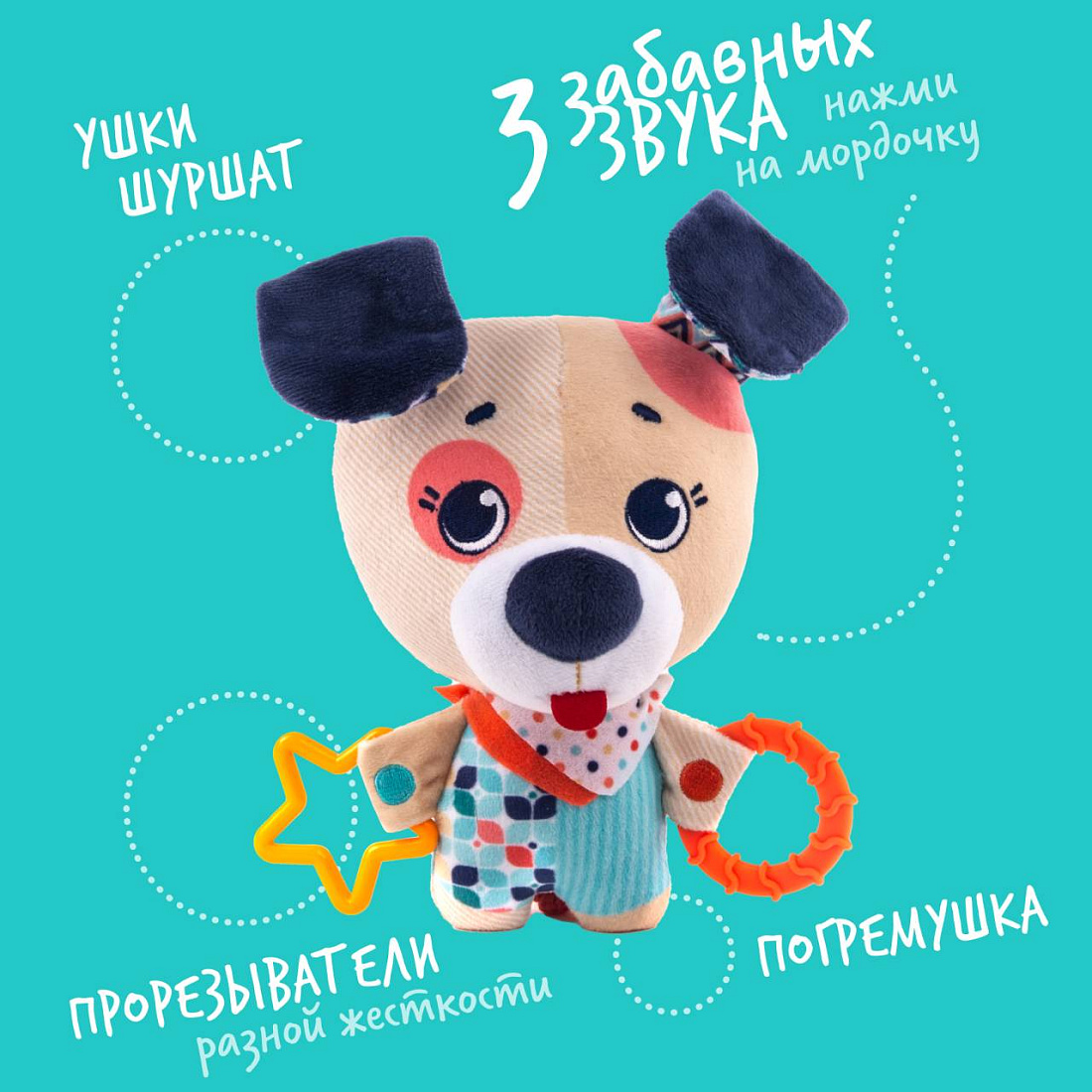 - Щенок с шуршащими ушками и погремушкой внутри поможет крохе в момент появления у него первых зубов, так как на лапках зак