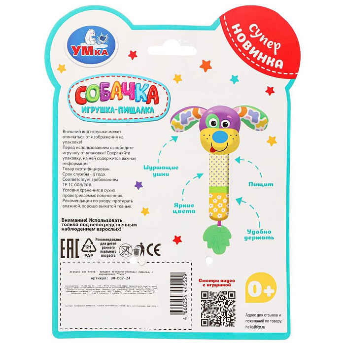 Эта игрушка в виде забавной собачки выполнена из гипоаллергенного разнофактурного текстиля красочной расцветки. При нажатии игрушка издаёт забавный пищащий звук, а если её потрясти - весело загремят шарики, надежно спрятанные внутри. Прорезыватель интересной формы из качественного безопасного материала пригодится малышу, когда у него будут резаться зубки.