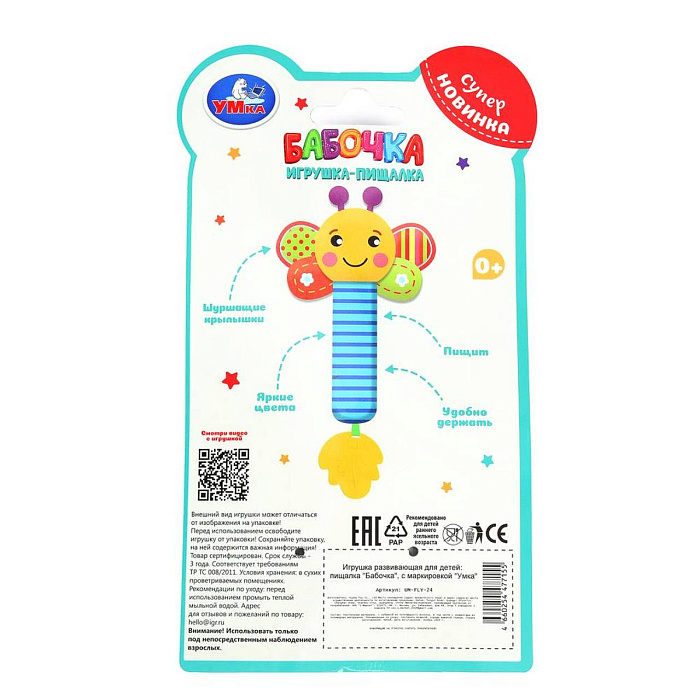 Текстильная игрушка-пищалка «Бабочка» ТМ «УМка» разработана специально для самых маленьких: