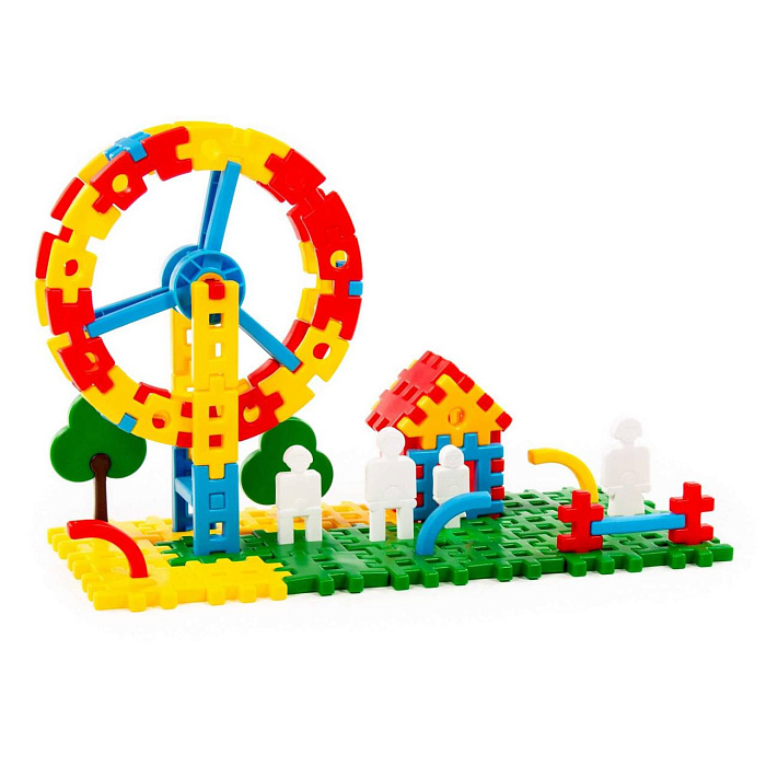 Конструктор «Луна-парк 1» в ведёрке от фабрики «Полесье» помогает ребёнку раскрыть творческие способности. Он состоит из ярких деталей разных форм и размеров. Из «строительного материала» для Луна-парка можно собрать домик, колесо обозрения, арочные ворота, качели, трамплин. Также в конструкторе имеются фигурки птиц, человечков, растений. Из ярких деталей малыш может создавать различные композиции, при этом у него развивается воображение, логическое мышление, мелкая моторика рук.
