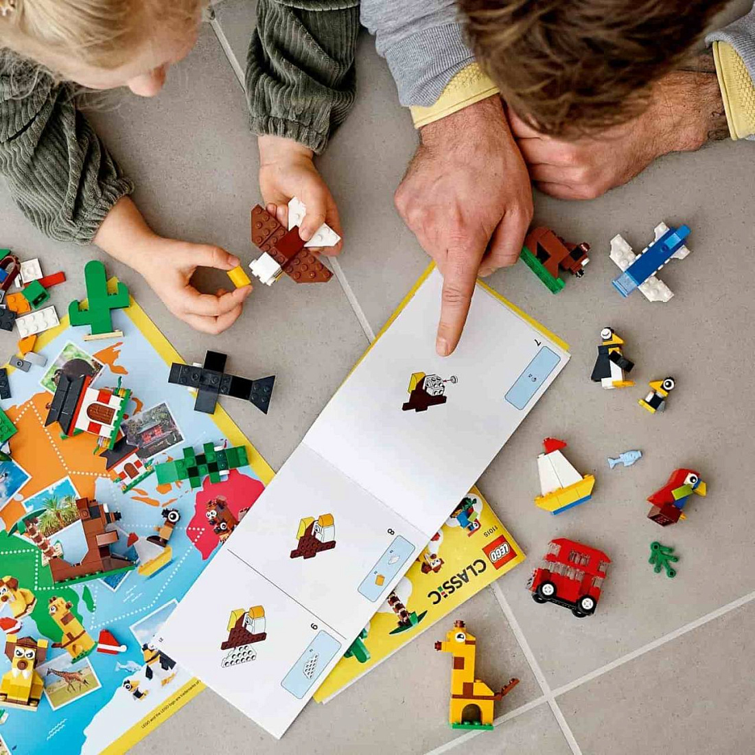 В наборе «Вокруг света» LEGO Classic (11015) представлено 15 идей для сборки, основанных на знаменитых животных и объектах со всего мира. Дети также получают красочную настенную карту, показывающую родной континент каждого животного и растения. Широкий ассортимент элементов LEGO и множество дополнительных кубиков в коробке дают зеленый свет открытому творчеству.