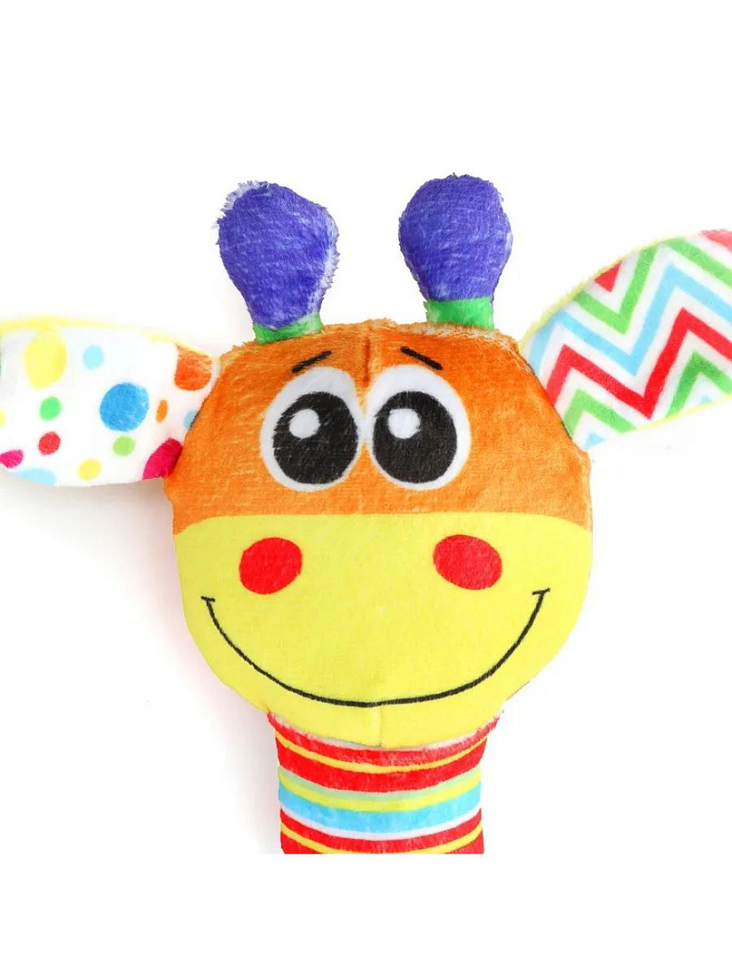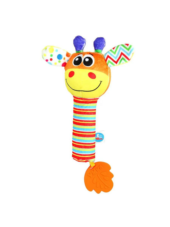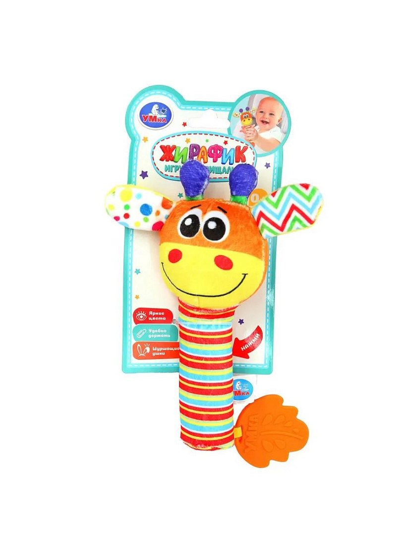 Текстильная игрушка погремушка - пищалка, жираф УМка UM-GIRAFE-24. Текстильная игрушка-погремушка с пищалкой «Жираф» ТМ «УМка» разработана специально для самых маленьких: - гремящие шарики - пищалка - яркие цвета - разнофактурные материалы - прорезыватель в виде листочка Эта игрушка в виде забавного жирафика выполнена из очень мягкого и гипоаллергенного материала красочной расцветки. При нажатии игрушка издаёт забавный пищащий звук, а если её потрясти - весело загремят шарики, надежно спрятанные внутри. Прорезыватель интересной формы из качественного безопасного материала пригодится малышу, когда у него будут резаться зубки. Игра с игрушкой-погремушкой ТМ «УМка» развивает: - слуховое восприятие - тактильные навыки - моторику - цветовосприятие.