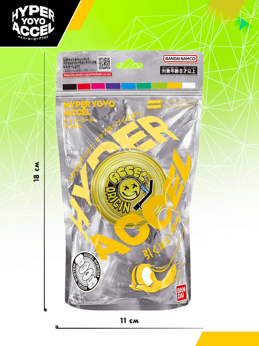 Открой для себя мир трюков с Hyper Yoyo Accel от Bandai! Уникальная запатентованная технология Accel System позволяет твоему йо-йо преодолевать законы физики и выполнять трюки, которые раньше считались невозможными! Дополнительный элемент ротации йо-йо позволяет игрушке быть стабилизированной и сохранять скорость вращения без дополнительных усилий. Ощути ритмы хип-хопа и практикуй нереальные трюки с Хайпер Йойо Аксель Желтый Хип-Хоп!