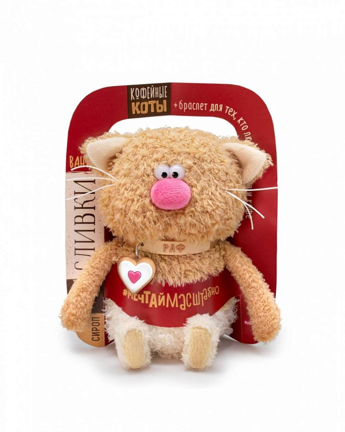 Очаровательный котик Какао из тактильно приятного эко меха цвета какао с молоком. Лапки и хвостик из более короткого меха. Усики из шелковистого крученого шнура. Объемный носик обтянут розовым софтом. Глазки из пластика. На пяточках и внутри ушек вшит сливочный софт. На шейке у котика силиконовый чокер с названием и небольшим подвесом в виде чашечки с какао. Чокер легко снимается и может послужить в качестве модного браслета для хозяина.