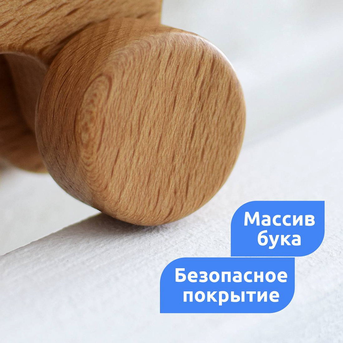 Преимущество каталки из натурального дерева состоит в том, что на нервную систему ребёнка исключается дополнительная нагрузка в виде цвета и картинок. Это помогает избежать переутомления при игре. Сохранение древесного узора благоприятно влияет на работу парасимпатической нервной системы, которая отвечает за успокоение и восстановление.