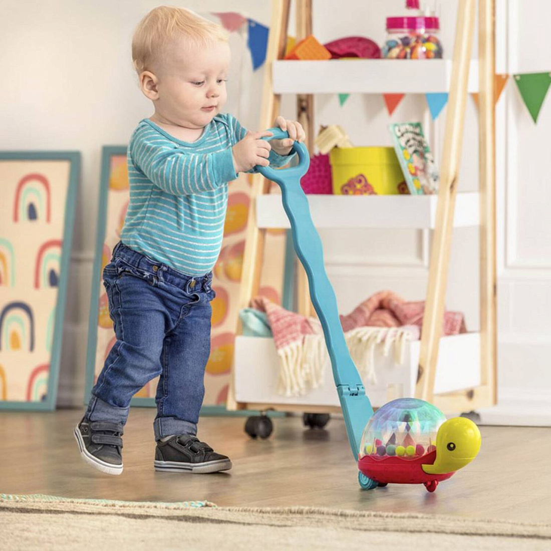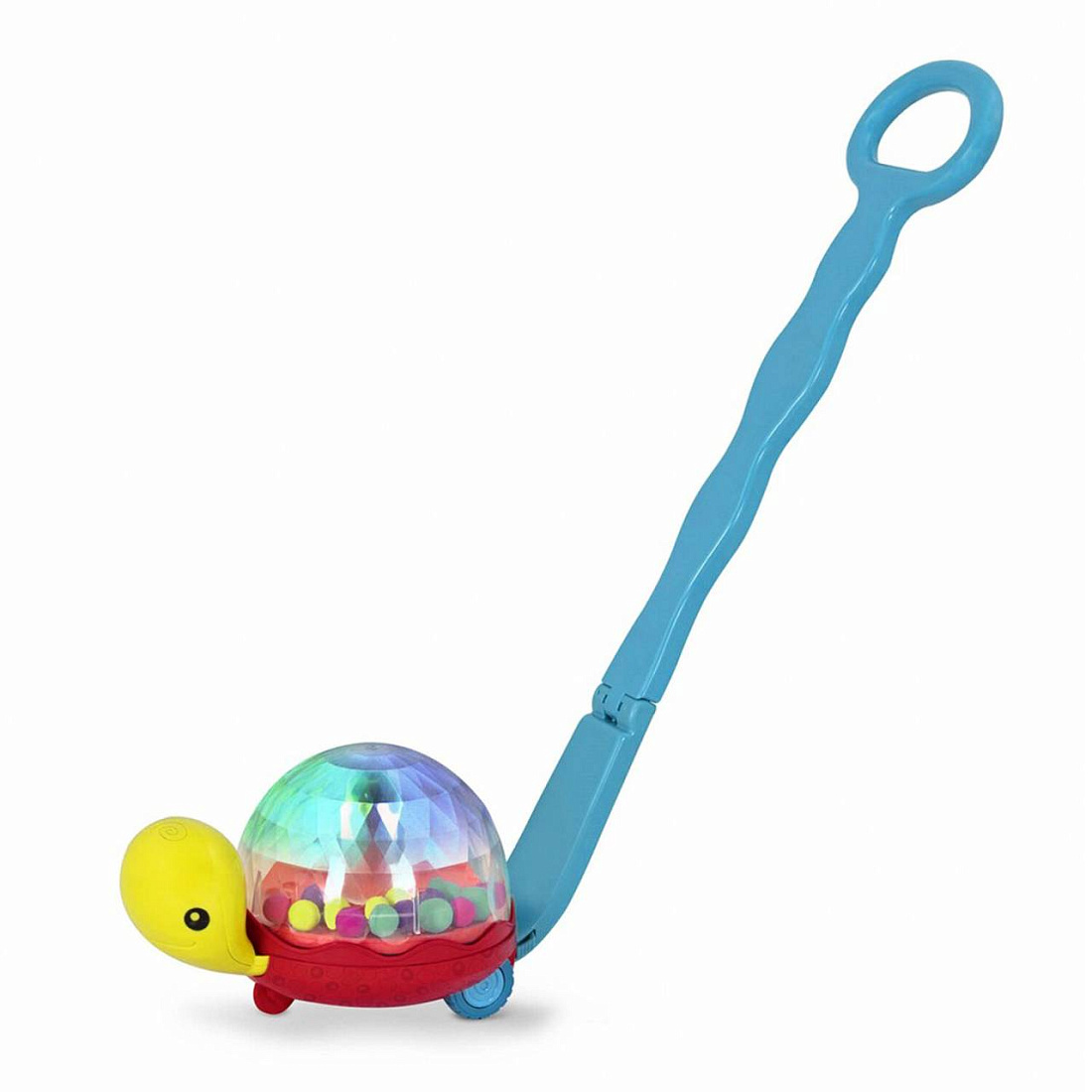 - Если ручку снять, черепашку можно катать по полу, как машинку. Или даже устроить с ней догонялки ползком.