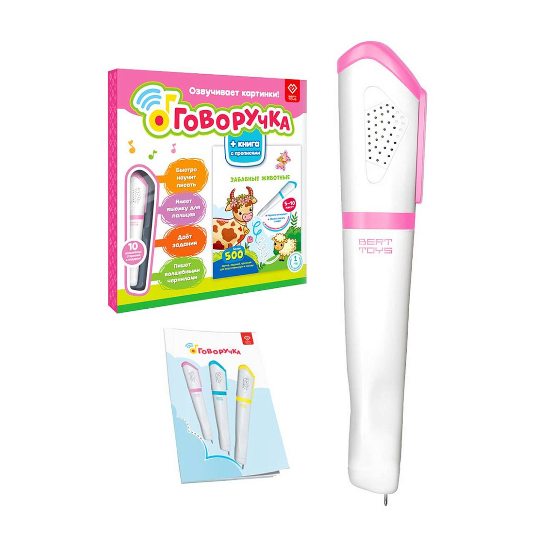 Никаких батареек! Заряжается от USB. В комплекте с игрушкой: большая книга, 10 стержней с исчезающими чернилами, провод USB, инстр