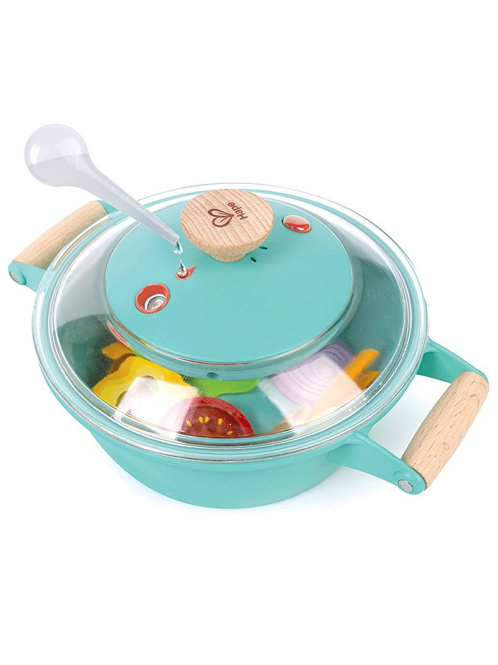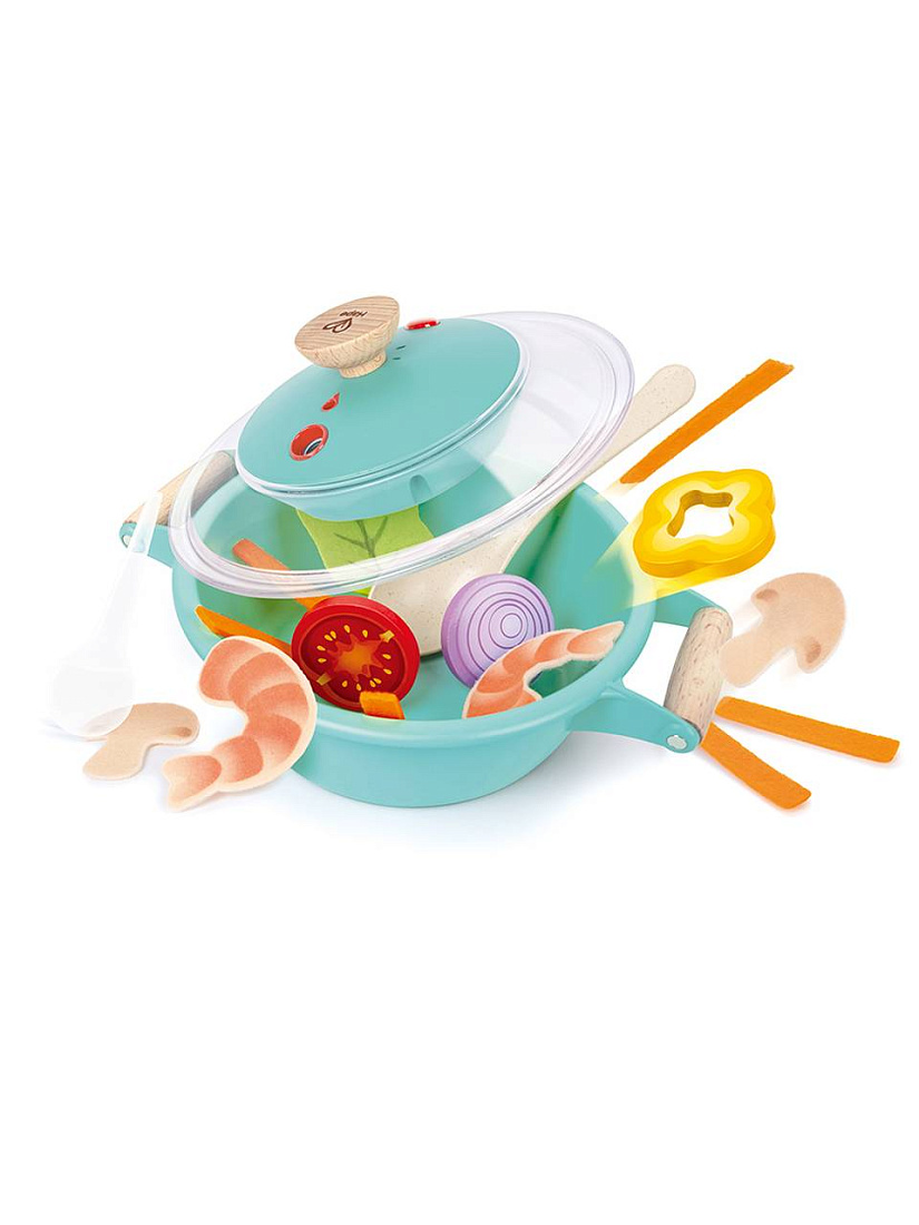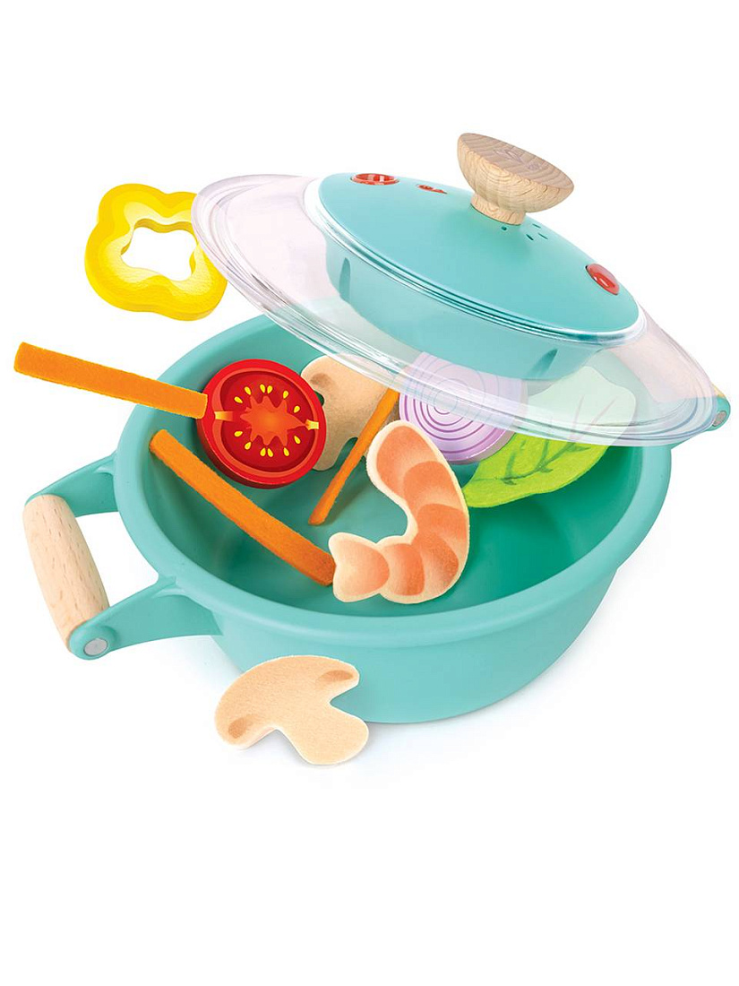 Включает в себя одну кастрюлю с крышкой, одну ложку, один ломтик желтого перца, один кусочек лука, один ломтик помидора, один лист салата, две креветки, два ломтика грибов, шесть ломтиков моркови и одну капельницу для воды.
