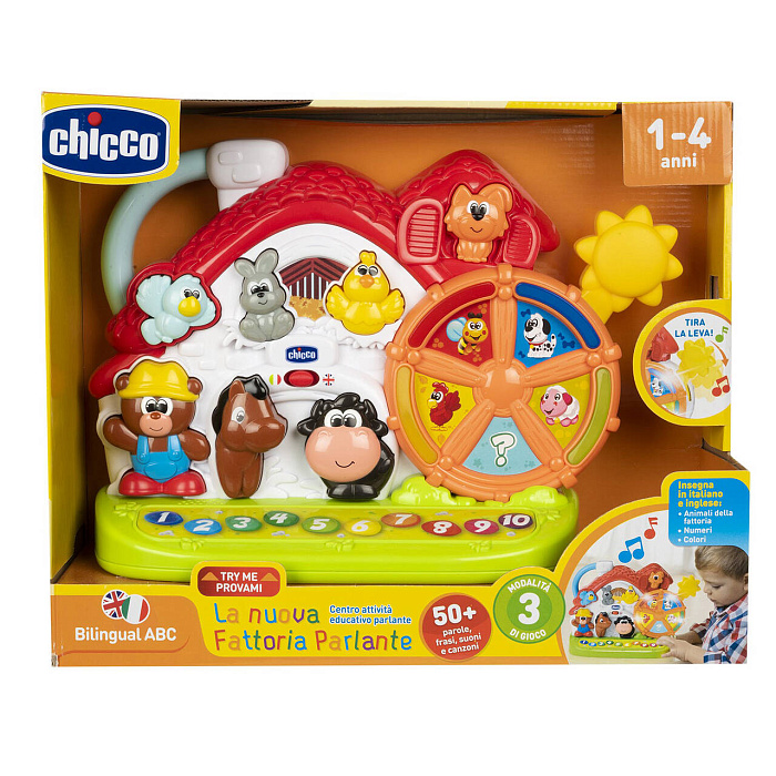 Развивающая музыкальная говорящая игрушка Chicco для детей от 1 года, обучает названиям и звукам животных на ферме, цветам, числам от 1 до 10. Интерактивная игрушка позволяет познакомиться со звуками и словами английского языка во время игры.Двуязычная игрушка способствует развитию гибкого мышления и расширения кругозора.Обучающая Игрушка стимулирует малыша говорить.