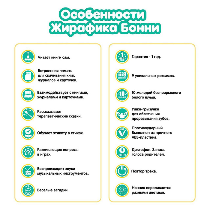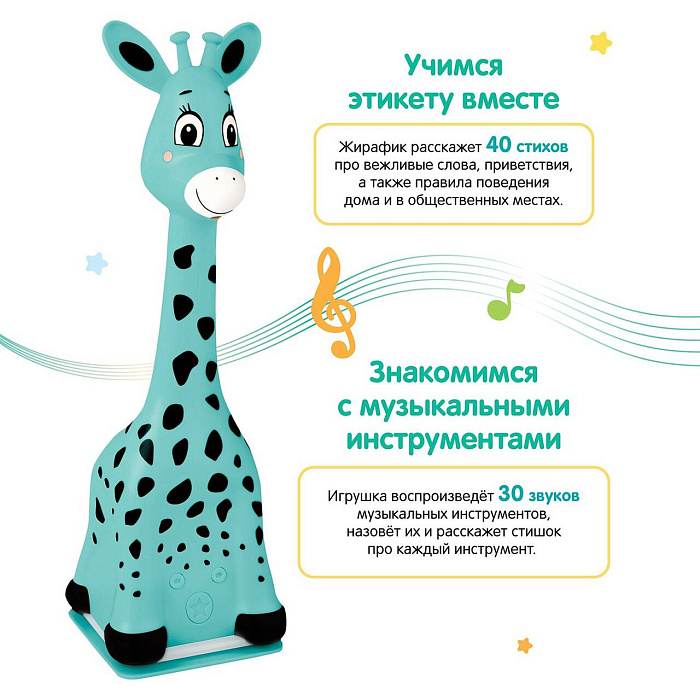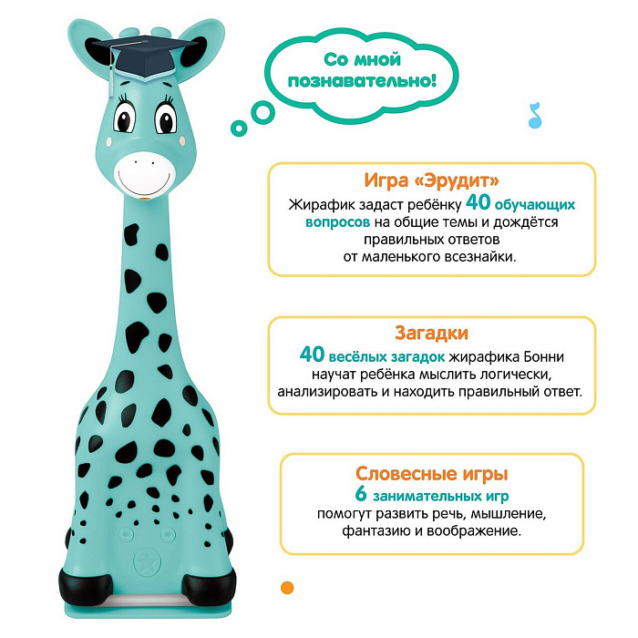 Вместе с Бонни легко развиваем речь, мышление, фантазию и воображение. Жирафик расскажет увлекающие терапевтические сказки, поиграет в словесные игры, задаст интересные загадки, обучит этикету, научит различать музыкальные инструменты.